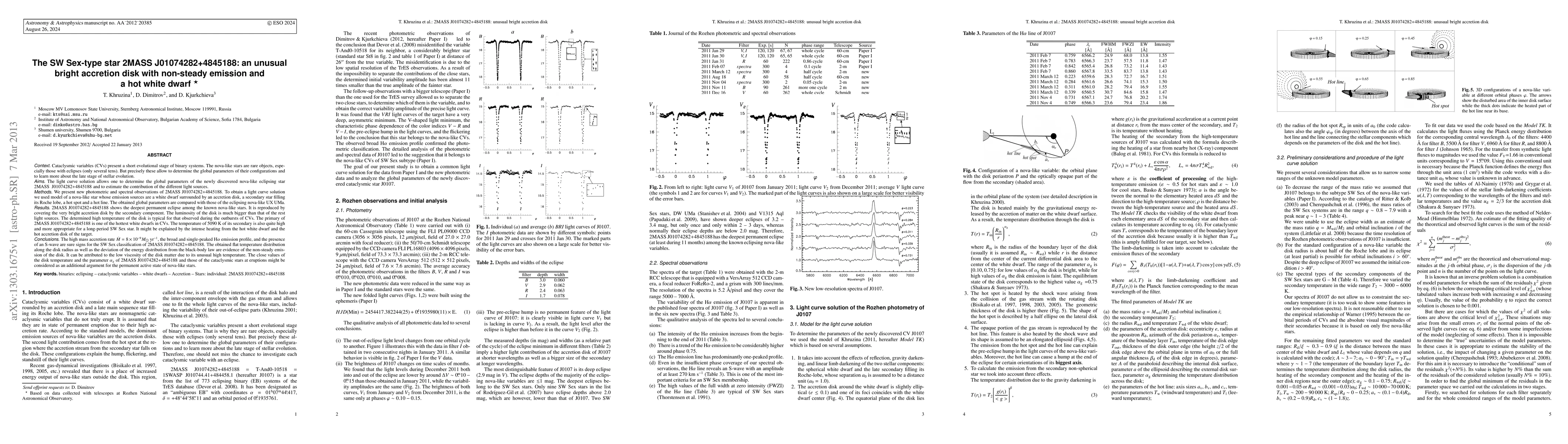 We present new photometric and spectral observations of the newly discovered nova-like eclipsing star 2MASS J01074282+4845188. To obtain a light curve solution we used model of a nova-like star whose emission sources are a white dwarf surrounded by an accretion disk, a secondary star filling its Roche lobe, a hot spot and a hot line. 2MASS J01074282+4845188 shows the deepest permanent eclipse among the known nova-like stars. It is reproduced by covering the very bright accretion disk by the secondary component. The luminosity of the disk is much bigger than that of the rest light sources. The determined high temperature of the disk is typical for that observed during the outbursts of CVs. The primary of 2MASS J01074282+4845188 is one of the hottest white dwarfs in CVs. The temperature of 5090 K of its secondary is also quite high and more appropriate for a long-period SW Sex star. It might be explained by the intense heating from the hot white dwarf and the hot accretion disk of the target. The high mass accretion rate $\dot{M} = 8\times 10^{-9} M_{\sun}$ yr$^{-1}$, the broad and single-peaked H$\alpha$ emission profile, and the presence of an S-wave are sure signs for the SW Sex classification of 2MASS J01074282+4845188. The obtained flat temperature distribution along the disk radius as well as the deviation of the energy distribution from the black-body law are evidence of the non-steady emission of the disk. The close values of the disk temperature and the parameter $\alpha_{g}$ of 2MASS J01074282+4845188 and those of the cataclysmic stars at eruptions might be considered as an additional argument for the permanent active state of nova-like stars.