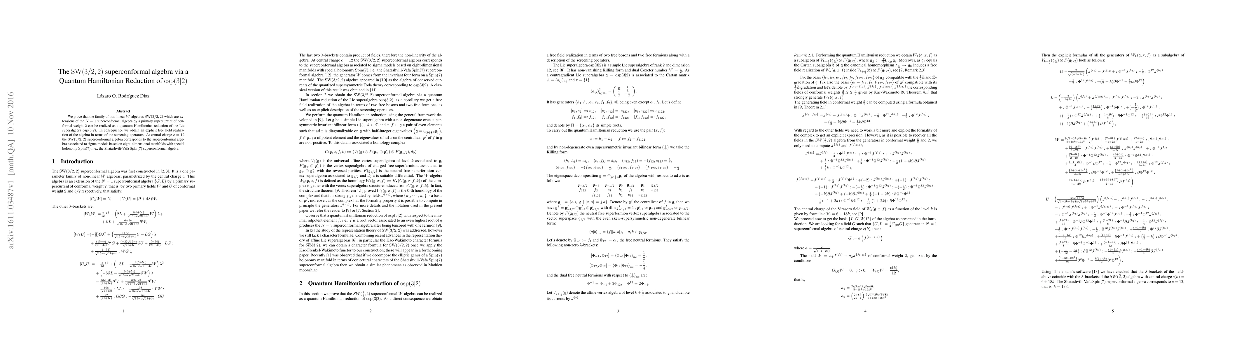 The $SW(3/2,2)$ superconformal algebra is realized as a quantum Hamiltonian reduction of the Lie superalgebra $osp(3|2)$, leading to an explicit free field realization of the algebra.