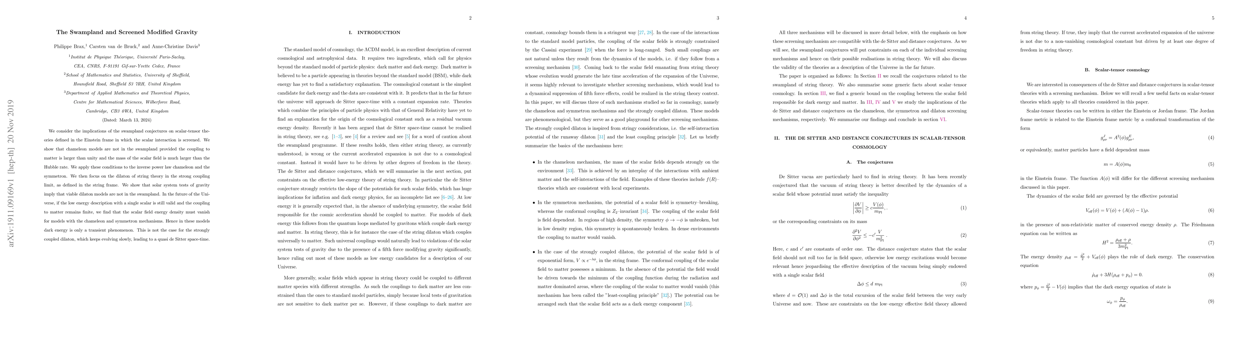 New research shows that modified gravity theories with screened scalar interactions can avoid the swampland conjectures under certain conditions. For dilaton models, however, solar system tests imply a non-swampy theory is needed to explain dark energy.