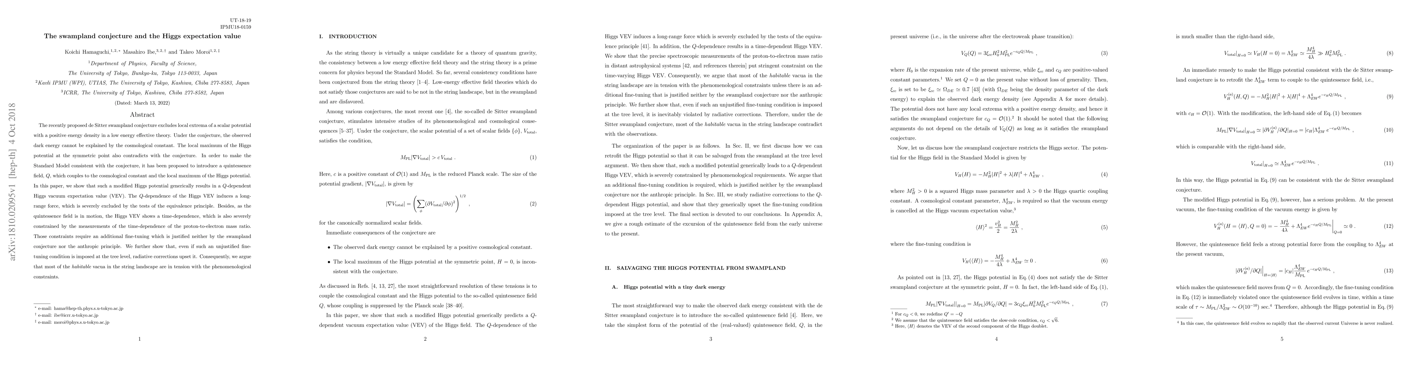 The recently proposed de Sitter swampland conjecture excludes local extrema of a scalar potential with a positive energy density in a low energy effective theory. Under the conjecture, the observed dark energy cannot be explained by the cosmological constant. The local maximum of the Higgs potential at the symmetric point also contradicts with the conjecture. In order to make the Standard Model consistent with the conjecture, it has been proposed to introduce a quintessence field, $Q$, which couples to the cosmological constant and the local maximum of the Higgs potential. In this paper, we show that such a modified Higgs potential generically results in a $Q$-dependent Higgs vacuum expectation value (VEV). The $Q$-dependence of the Higgs VEV induces a long-range force, which is severely excluded by the tests of the equivalence principle. Besides, as the quintessence field is in motion, the Higgs VEV shows a time-dependence, which is also severely constrained by the measurements of the time-dependence of the proton-to-electron mass ratio. Those constraints require an additional fine-tuning which is justified neither by the swampland conjecture nor the anthropic principle. We further show that, even if such an unjustified fine-tuning condition is imposed at the tree level, radiative corrections upset it. Consequently, we argue that most of the habitable vacua in the string landscape are in tension with the phenomenological constraints.