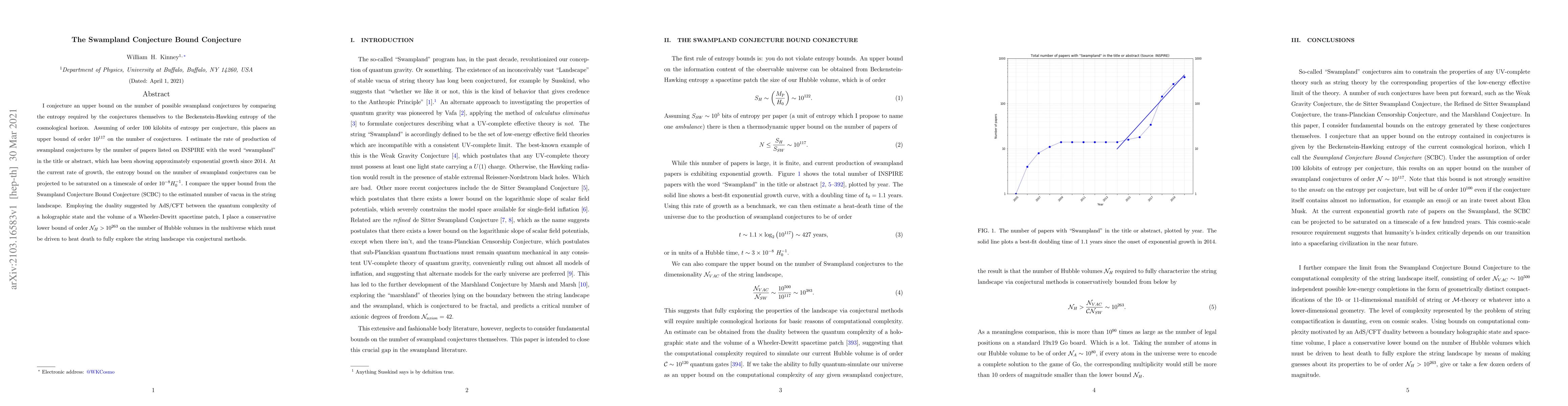 The Swampland Conjecture Bound Conjecture proposes an upper limit of $10^{117}$ on the number of possible swampland conjectures based on entropy considerations, while estimating the current exponential growth rate of swampland-related research papers. It also suggests that exploring the string landscape via conjectural methods would require driving a vast number of Hubble volumes to heat death.