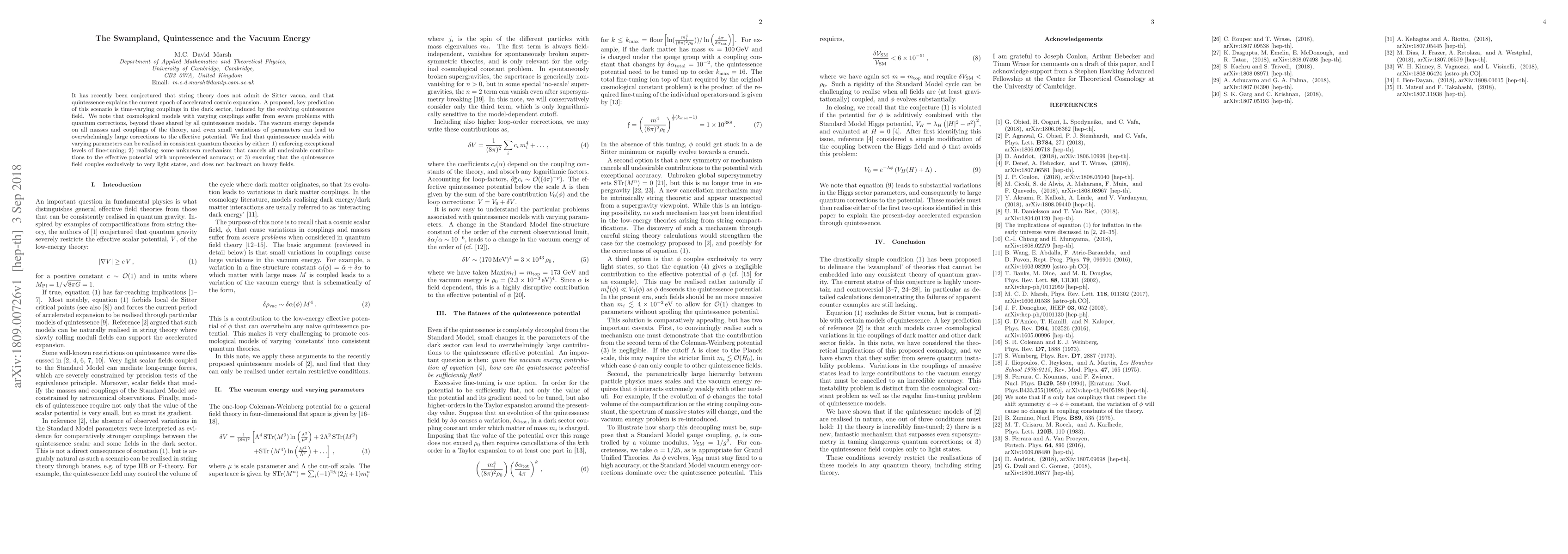 It has recently been conjectured that string theory does not admit de Sitter vacua, and that quintessence explains the current epoch of accelerated cosmic expansion. A proposed, key prediction of this scenario is time-varying couplings in the dark sector, induced by the evolving quintessence field. We note that cosmological models with varying couplings suffer from severe problems with quantum corrections, beyond those shared by all quintessence models. The vacuum energy depends on all masses and couplings of the theory, and even small variations of parameters can lead to overwhelmingly large corrections to the effective potential. We find that quintessence models with varying parameters can be realised in consistent quantum theories by either: 1) enforcing exceptional levels of fine-tuning; 2) realising some unknown mechanism that cancels all undesirable contributions to the effective potential with unprecedented accuracy; or 3) ensuring that the quintessence field couples exclusively to very light states, and does not backreact on heavy fields.