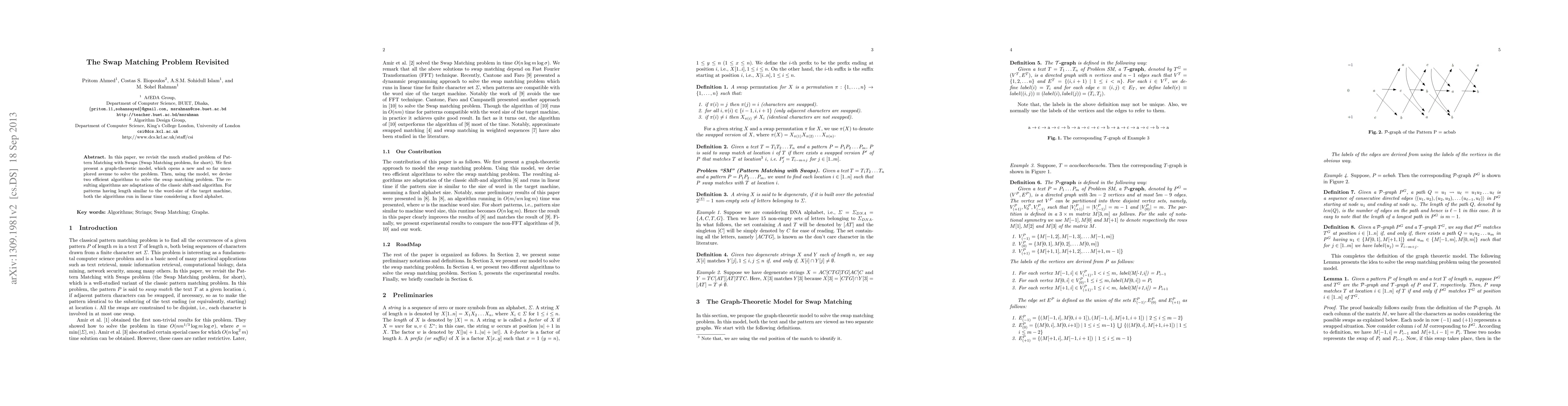 In this paper, we revisit the much studied problem of Pattern Matching with Swaps (Swap Matching problem, for short). We first present a graph-theoretic model, which opens a new and so far unexplored avenue to solve the problem. Then, using the model, we devise two efficient algorithms to solve the swap matching problem. The resulting algorithms are adaptations of the classic shift-and algorithm. For patterns having length similar to the word-size of the target machine, both the algorithms run in linear time considering a fixed alphabet.