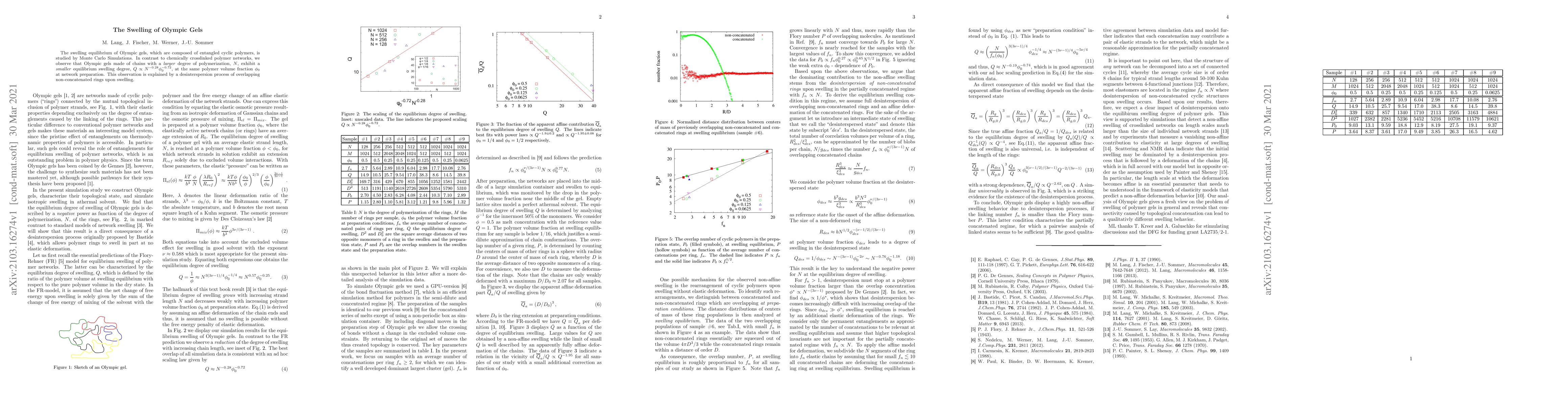 This study uses Monte Carlo Simulations to investigate the swelling equilibrium of Olympic gels, composed of entangled cyclic polymers. It finds that gels with a larger degree of polymerization show a smaller swelling degree, attributed to a desinterspersion process of overlapping rings during swelling.