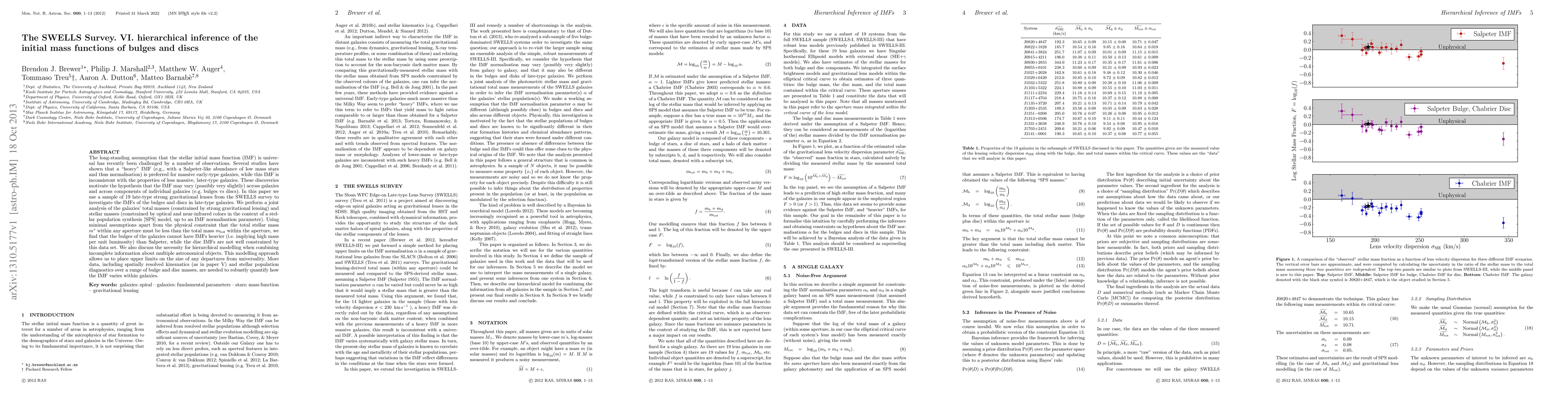 The long-standing assumption that the stellar initial mass function (IMF) is universal has recently been challenged by a number of observations. Several studies have shown that a "heavy" IMF (e.g., with a Salpeter-like abundance of low mass stars and thus normalisation) is preferred for massive early-type galaxies, while this IMF is inconsistent with the properties of less massive, later-type galaxies. These discoveries motivate the hypothesis that the IMF may vary (possibly very slightly) across galaxies and across components of individual galaxies (e.g. bulges vs discs). In this paper we use a sample of 19 late-type strong gravitational lenses from the SWELLS survey to investigate the IMFs of the bulges and discs in late-type galaxies. We perform a joint analysis of the galaxies' total masses (constrained by strong gravitational lensing) and stellar masses (constrained by optical and near-infrared colours in the context of a stellar population synthesis [SPS] model, up to an IMF normalisation parameter). Using minimal assumptions apart from the physical constraint that the total stellar mass within any aperture must be less than the total mass within the aperture, we find that the bulges of the galaxies cannot have IMFs heavier (i.e. implying high mass per unit luminosity) than Salpeter, while the disc IMFs are not well constrained by this data set. We also discuss the necessity for hierarchical modelling when combining incomplete information about multiple astronomical objects. This modelling approach allows us to place upper limits on the size of any departures from universality. More data, including spatially resolved kinematics (as in paper V) and stellar population diagnostics over a range of bulge and disc masses, are needed to robustly quantify how the IMF varies within galaxies.