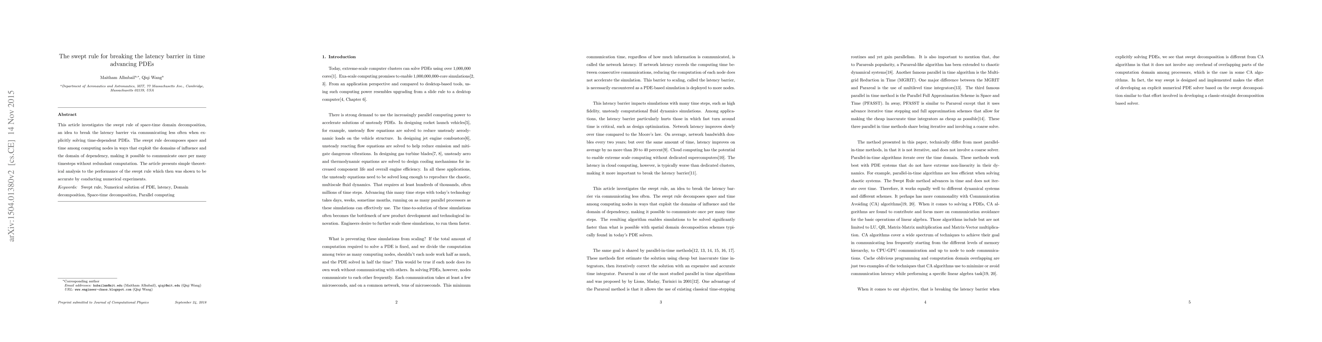 This paper explores the swept rule for space-time domain decomposition to reduce latency in solving time-dependent PDEs, demonstrating its efficiency through theoretical analysis and numerical experiments. The method minimizes communication frequency by optimizing domain decomposition and dependency management.