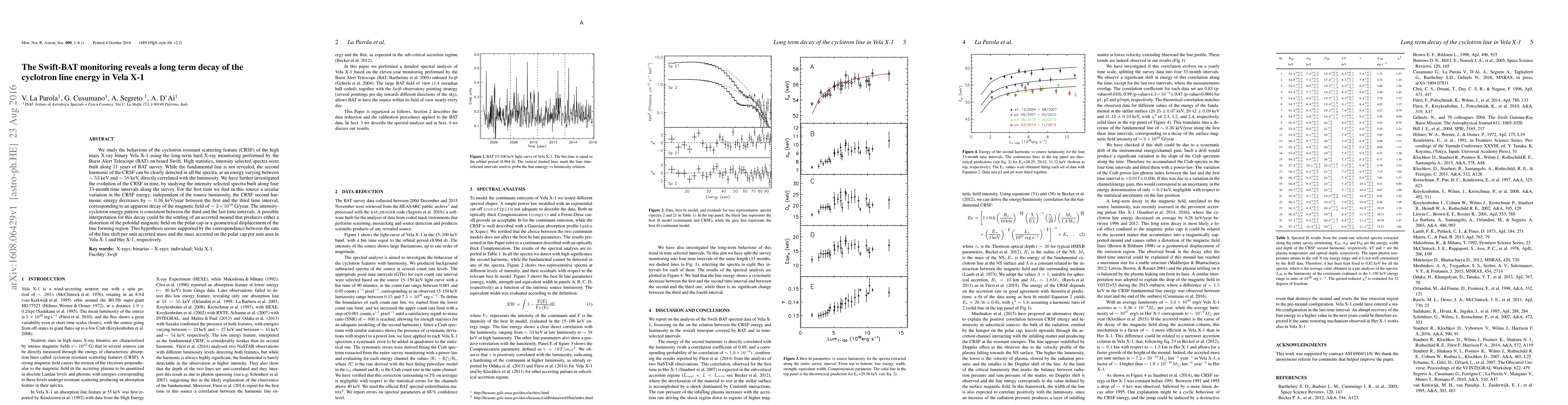 The long-term monitoring of Vela X-1 using the Swift-BAT reveals a secular decay in the energy of the cyclotron resonant scattering feature (CRSF) second harmonic, independent of luminosity, suggesting a decline in the magnetic field strength. This decay may be due to the settling of an accreted mound affecting the magnetic field or the geometry of the line-forming region.