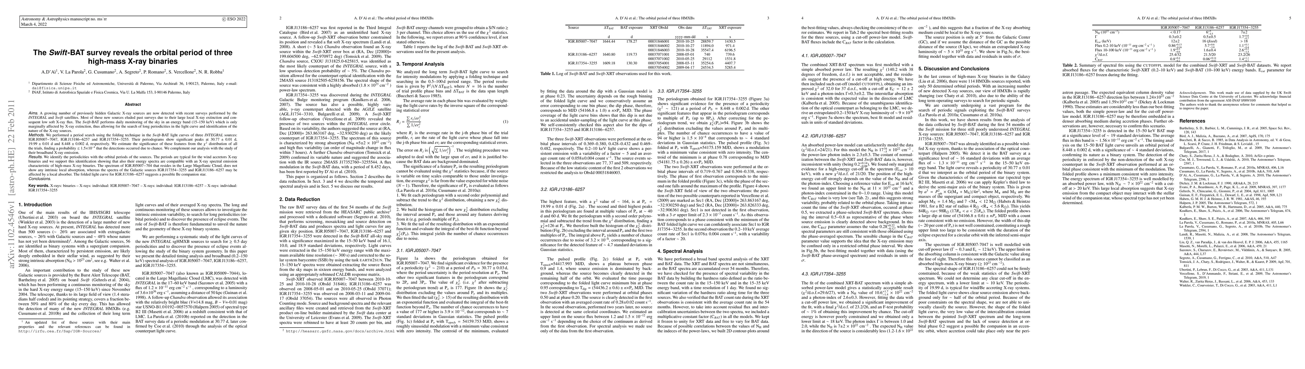 A growing number of previously hidden Galactic X-ray sources are now detected with recent surveys performed by the Integral and Swift satellites. Most of these new sources eluded past surveys due to their large local X-ray extinction and consequent low soft X-ray flux. The Swift-BAT performs daily monitoring of the sky in an energy band (15-150 keV) which is only marginally affected by X-ray extinction, thus allowing for the search of long periodicities in the light curve and identification of the nature of the X-ray sources. We performed a period search using the folding technique in the Swift-BAT light curves of three Integral sources: IGR J05007-7047, IGR J13186-6257 and IGR J17354-3255. Their periodograms show significant peaks at 30.77$\pm$0.01 d, 19.994$\pm$0.01 d and 8.448$\pm$0.002 d, respectively. We estimate the significance of these features from the chi squared distribution of all the trials, finding a probability less than 1.5$\times10^{-4}$ that the detections occurred due to chance. We complement our analysis with the study of their broadband X-ray emission. We identify the periodicities with the orbital periods of the sources. The periods are typical for the wind accretors X-ray binaries and we support this identification showing that also their energy spectra are compatible with an X-ray spectral emission characteristic of high-mass X-ray binaries. The spectrum of IGR J05007-704 that resides in the Large Magellanic Cloud, does not show any intrinsic local absorption, whereas the spectra of the Galactic sources IGR J17354-3255 and IGR J13186-6257 may be affected by a local absorber. The folded light curve for IGR J13186-6257 suggests a possible Be companion star.