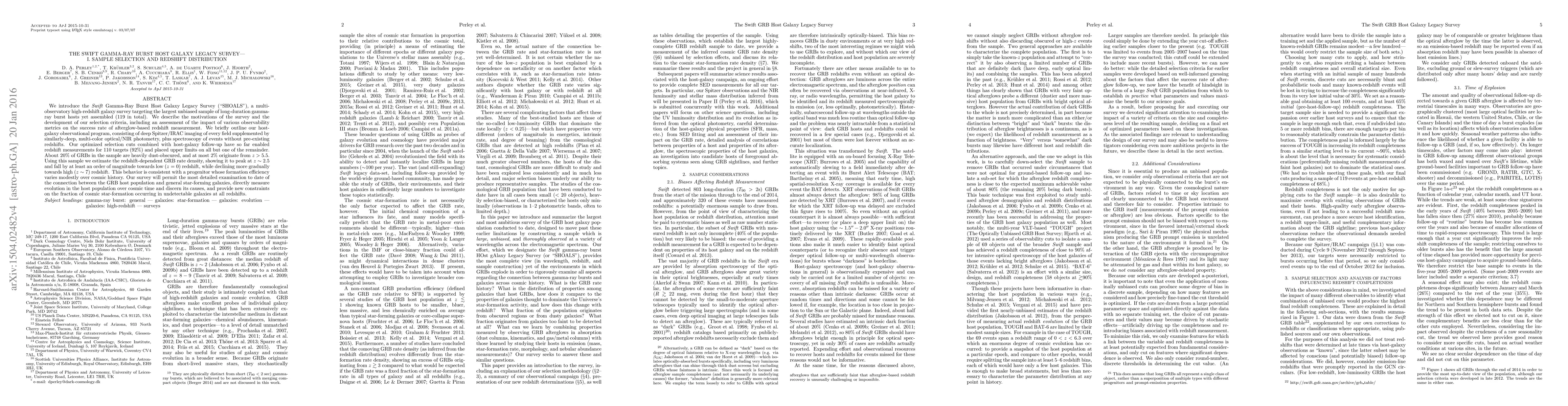 The Swift Gamma-Ray Burst Host Galaxy Legacy Survey (SHOALS) assembles the largest unbiased sample of long-duration gamma-ray burst (GRB) hosts, enabling redshift measurements for 92% of the sample. The survey reveals a peak in GRB rate density at z~2.5, declining towards lower and higher redshifts, suggesting a progenitor with modest formation efficiency variation over cosmic time.