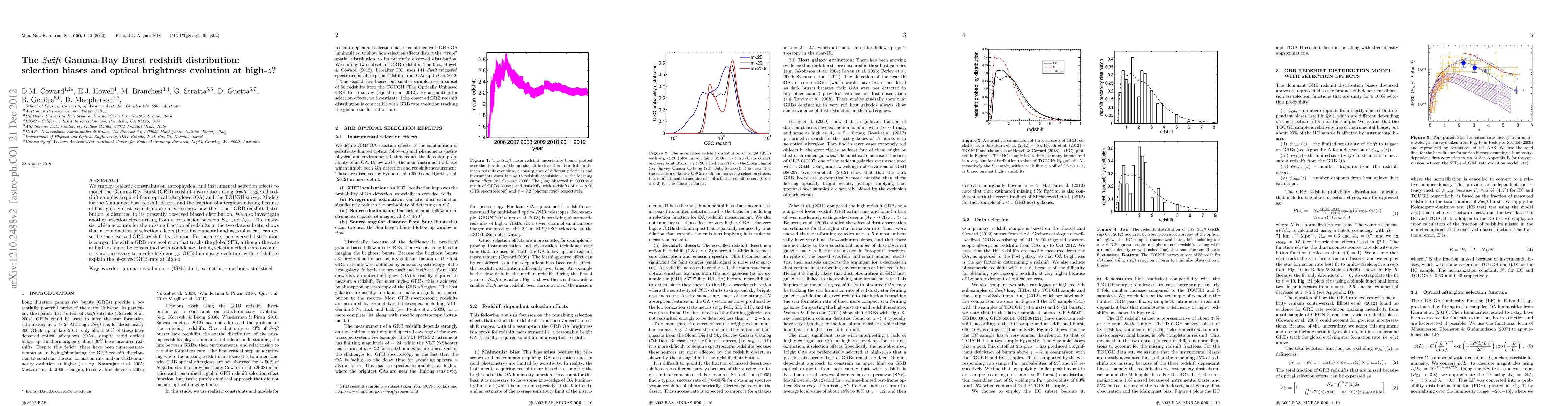 The study models the Gamma-Ray Burst (GRB) redshift distribution using Swift triggered redshift samples from optical afterglows (OA) and the TOUGH survey, accounting for various selection effects such as Malmquist bias, redshift desert, and dust extinction.