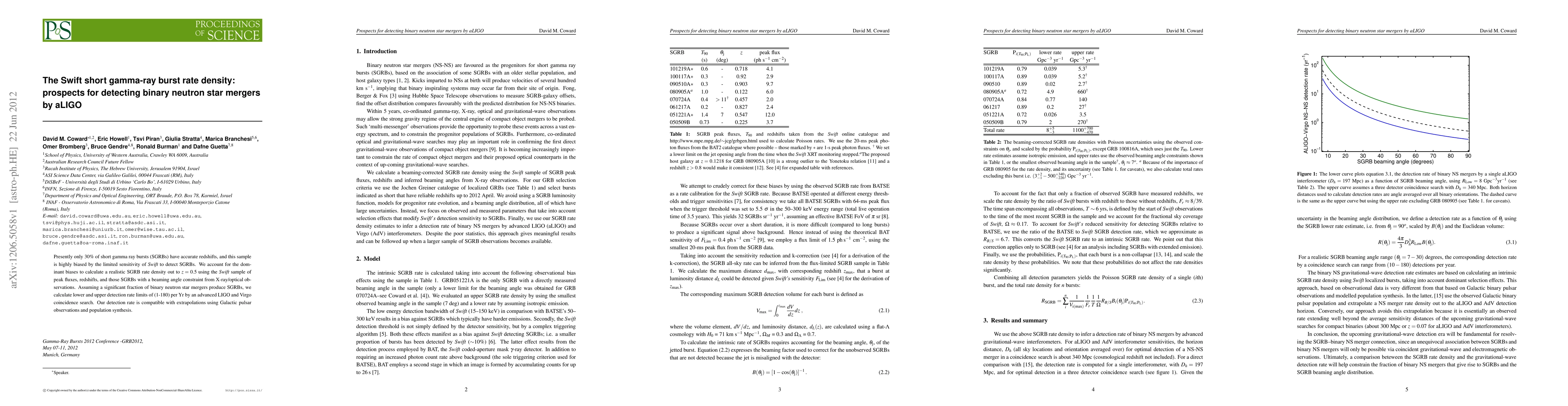 Presently only 30% of short gamma ray bursts (SGRBs) have accurate redshifts, and this sample is highly biased by the limited sensitivity of {\it Swift} to detect SGRBs. We account for the dominant biases to calculate a realistic SGRB rate density out to $z = 0.5$ using the {\it Swift} sample of peak fluxes, redshifts, and those SGRBs with a beaming angle constraint from X-ray/optical observations. Assuming a significant fraction of binary neutron star mergers produce SGRBs, we calculate lower and upper detection rate limits of (1-180) per Yr by an advanced LIGO and Virgo coincidence search. Our detection rate is compatible with extrapolations using Galactic pulsar observations and population synthesis.