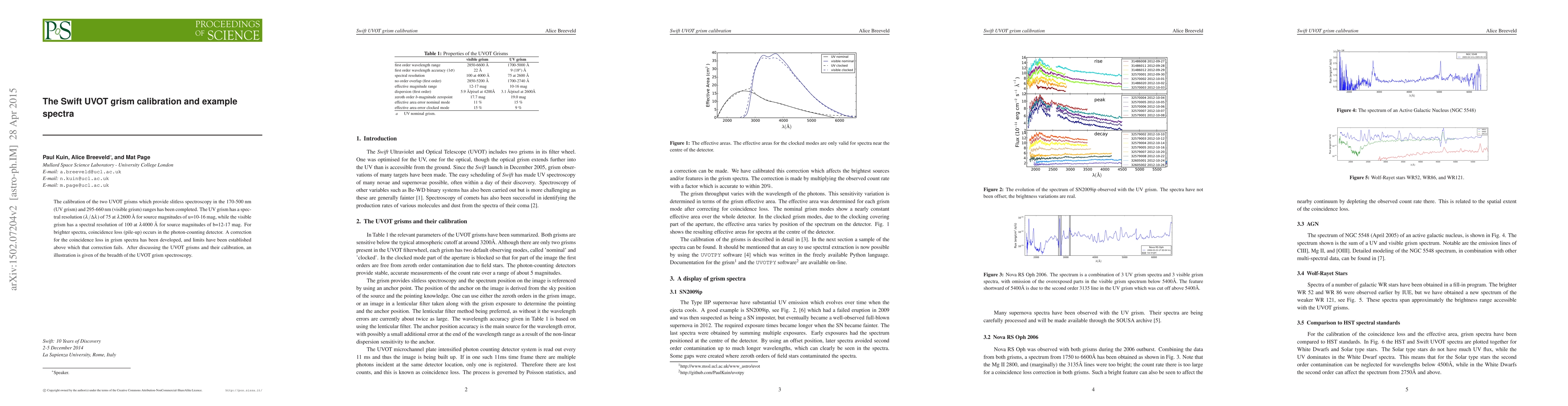 This paper details the calibration of the UVOT grisms for slitless spectroscopy, covering UV and visible ranges, and presents a correction method for brighter spectra. It demonstrates the grisms' spectral resolutions and provides examples of their spectroscopic capabilities.