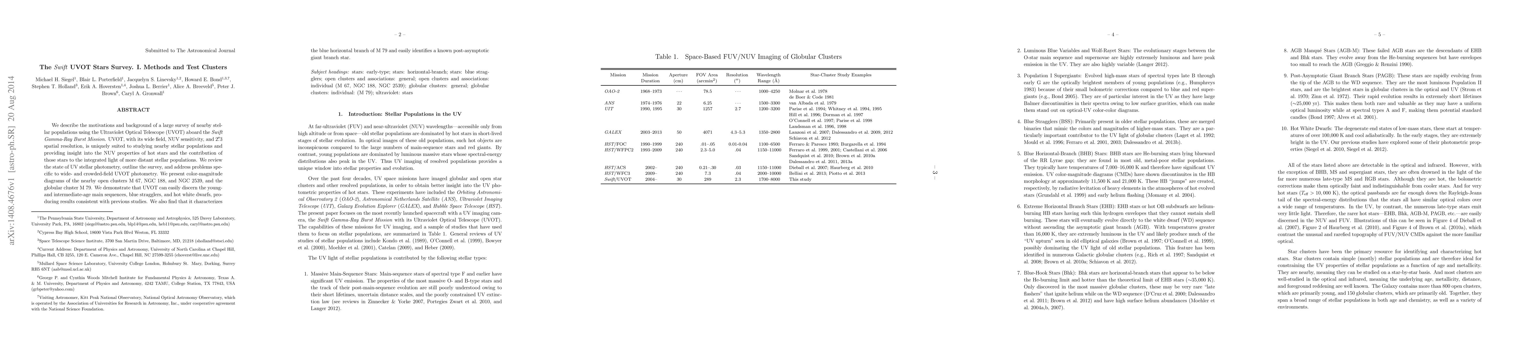 We describe the motivations and background of a large survey of nearby stel- lar populations using the Ultraviolet Optical Telescope (UVOT) aboard the Swift Gamma-Ray Burst Mission. UVOT, with its wide field, NUV sensitivity, and 2.3 spatial resolution, is uniquely suited to studying nearby stellar populations and providing insight into the NUV properties of hot stars and the contribution of those stars to the integrated light of more distant stellar populations. We review the state of UV stellar photometry, outline the survey, and address problems spe- cific to wide- and crowded-field UVOT photometry. We present color-magnitude diagrams of the nearby open clusters M 67, NGC 188, and NGC 2539, and the globular cluster M 79. We demonstrate that UVOT can easily discern the young- and intermediate-age main sequences, blue stragglers, and hot white dwarfs, pro- ducing results consistent with previous studies. We also find that it characterizes the blue horizontal branch of M 79 and easily identifies a known post-asymptotic giant branch star.