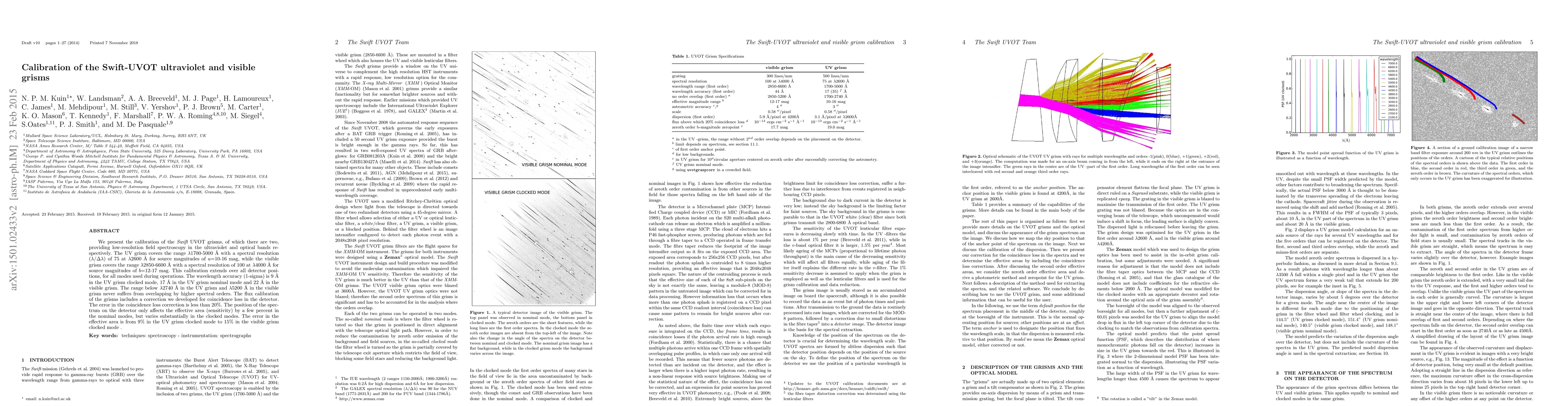 This paper details the calibration of the Swift UVOT grisms, providing low-resolution spectroscopy in ultraviolet and optical bands. The calibration achieves high wavelength accuracy and corrects for coincidence loss, with effective area errors varying by mode and grism.