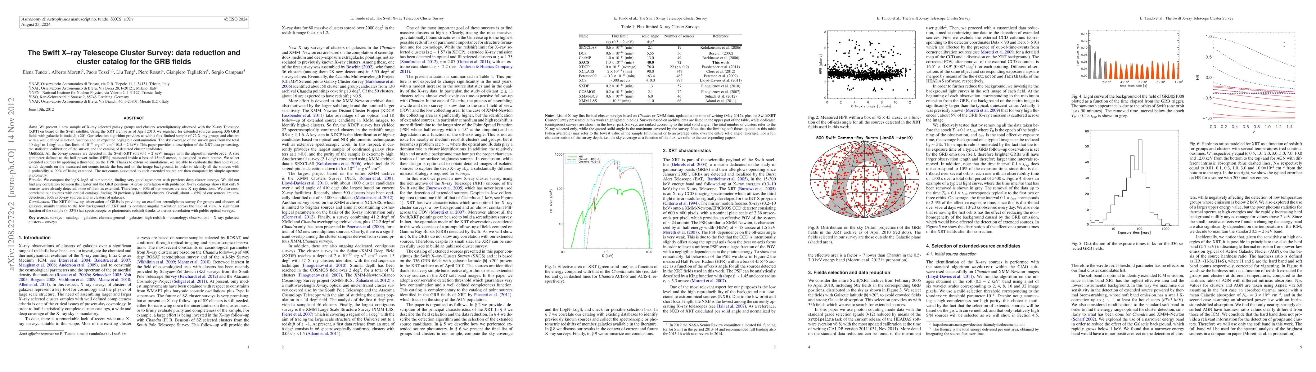 (abridged) We present a new sample of X-ray selected galaxy groups and clusters serendipitously observed with Swift and the X-ray Telescope (XRT). We searched the XRT archive for extended sources among 336 GRB fields with galactic latitude |b|>20{\deg}. Our selection algorithm yields a flux-limited sample of 72 X-ray groups and clusters with a well defined selection function and negligible contamination. The sky coverage of the survey goes from the total 40 deg^2 to 1 deg^2 at a flux limit of 10^-14 erg/s/cm^-2 (0.5-2 keV). Here we describe the XRT data processing, the statistical calibration of the survey, and the catalog of detected cluster candidates. All the X-ray sources are detected in the Swift-XRT soft (0.5-2 keV) band. A size parameter defined as the half power radius (HPR) measured inside a box of 45x45 arcsec, is assigned to each source. We select extended sources by applying a threshold on the Half Power Radius and we calibrate its dependence on the measured net counts and on the image background with extensive simulations in order to identify all the sources with ~99% probability of being extended. We compute the logN-logS of our sample, finding very good agreement with previous deep cluster surveys. A cross correlation with published X-ray catalogs shows that only 9 sources were already detected, none of them as extended. Therefore, ~90% of our sources are new X-ray detections. We also cross correlated our sources with optical catalogs, finding 20 previously identified clusters. Overall, about ~65% of our sources are new detections. The XRT follow-up observation of GRBs is providing an excellent serendipitous survey for groups and clusters of galaxies, mainly thanks to the low background of XRT and its constant angular resolution across the field of view. About 33% of the sample has spectroscopic or photometric redshifts from public optical surveys.