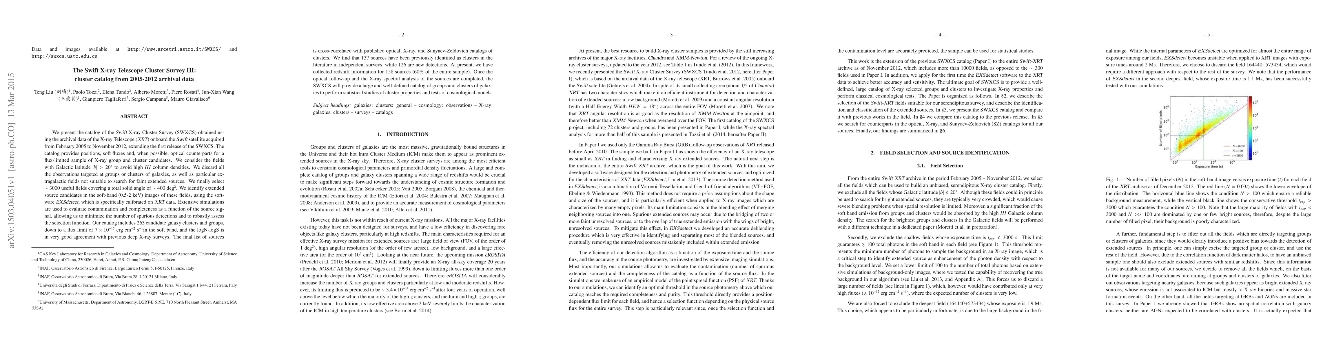 This study presents the Swift X-ray Cluster Survey (SWXCS) catalog, compiled from 2005-2012 Swift satellite data. It identifies 263 galaxy cluster and group candidates, with 137 previously known and 126 new discoveries. The survey, targeting fields with high Galactic latitude to reduce HI column density, uses specialized software to detect extended X-ray sources, ensuring minimal spurious detections. The catalog aims to provide a comprehensive resource for statistical cluster property studies and cosmological model testing once complete with optical follow-up and X-ray spectral analysis.