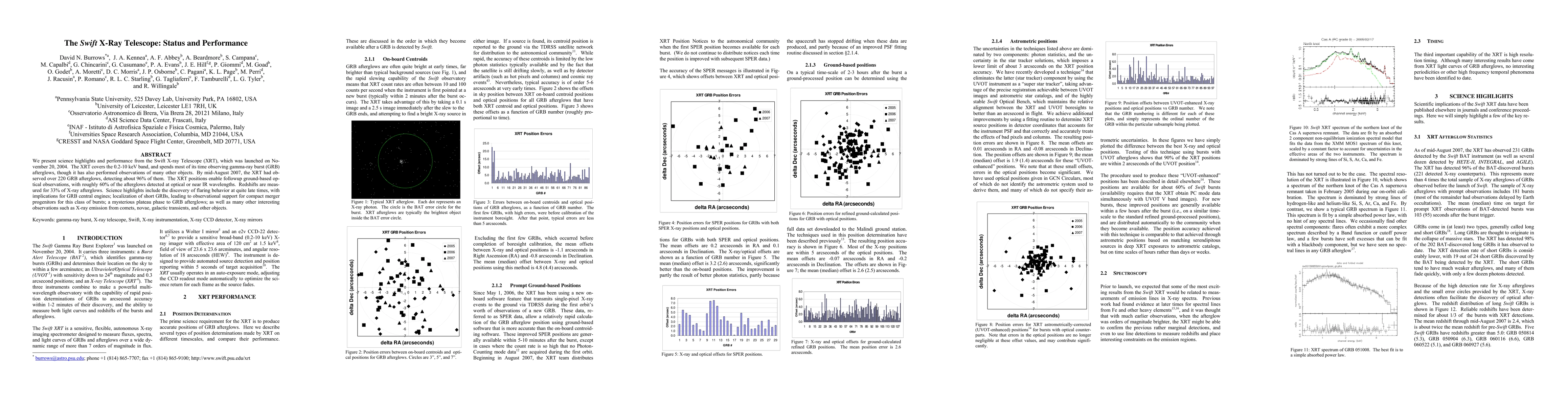 The Swift X-ray Telescope (XRT) launched in 2004, primarily observing gamma-ray burst afterglows, and has detected about 96% of them, enabling followup optical observations. Key science highlights include late-time flaring behavior, localization of short GRBs, and a mysterious plateau phase in afterglows.