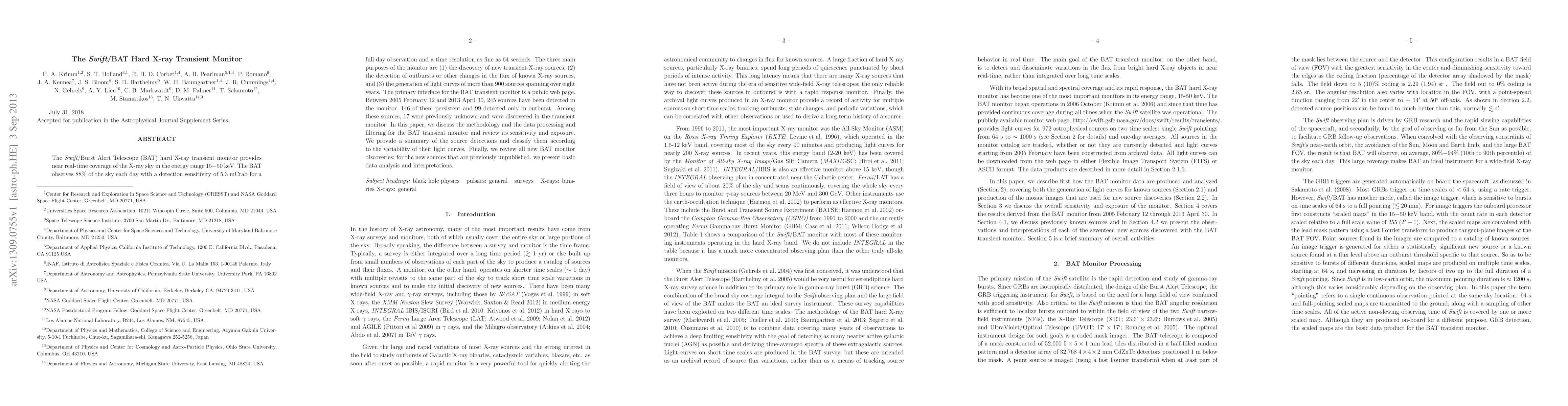 The Swift/BAT Hard X-ray Transient Monitor provides near real-time coverage of the X-ray sky in the 15-50 keV energy range, observing 88% of the sky daily with a sensitivity of 5.3 mCrab for full-day observations and a time resolution as fine as 64 seconds.