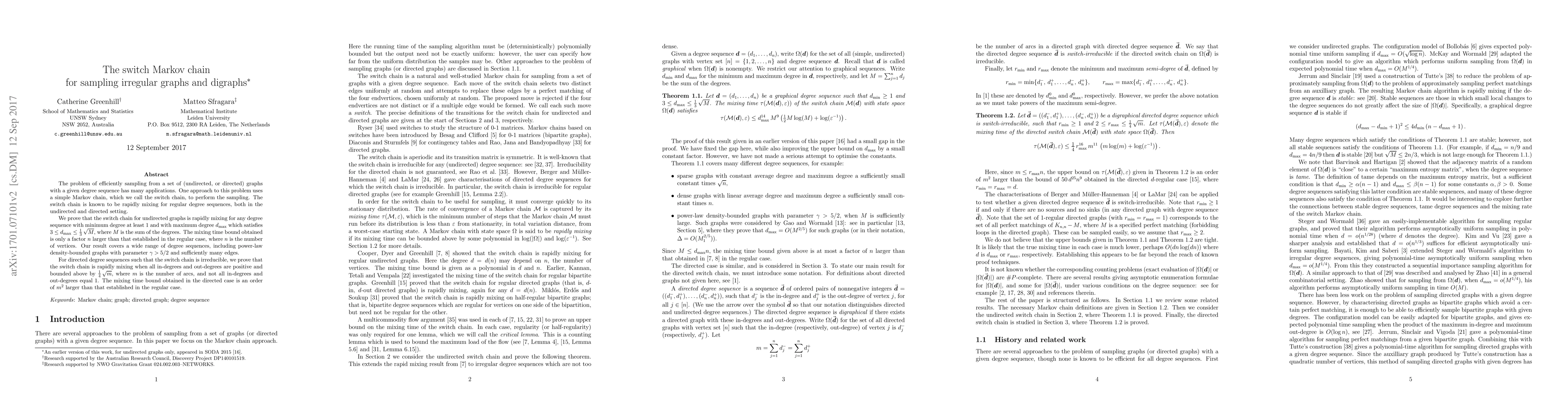 The paper's primary technical contribution is the proof of rapid mixing for the switch chain under specified conditions for both undirected and directed graphs, providing a theoretical foundation for efficient sampling of irregular graphs and digraphs.