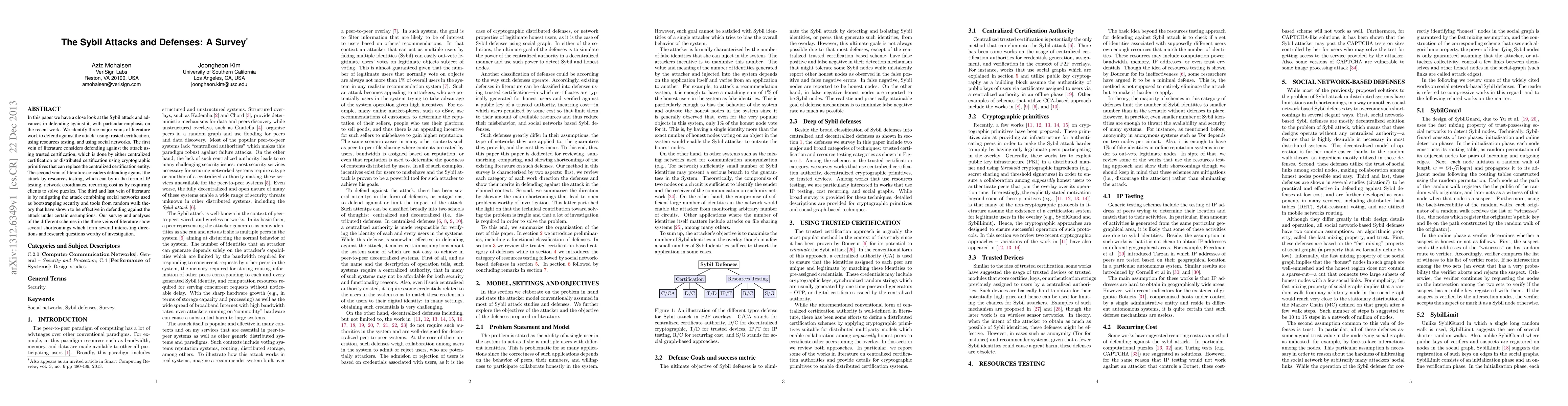 This paper surveys Sybil attack defenses, identifying three approaches: trusted certification, resources testing, and social network-based solutions. It highlights shortcomings in these methods, sparking new research directions.