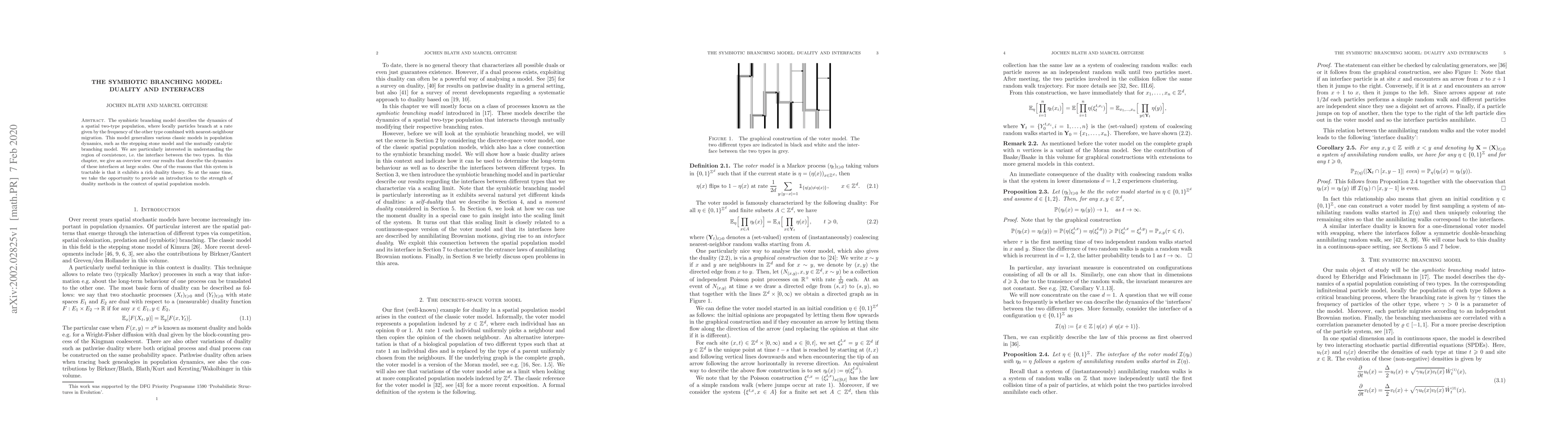 The symbiotic branching model describes the dynamics of a spatial two-type population, where locally particles branch at a rate given by the frequency of the other type combined with nearest-neighbour migration. This model generalizes various classic models in population dynamics, such as the stepping stone model and the mutually catalytic branching model. We are particularly interested in understanding the region of coexistence, i.e. the interface between the two types. In this chapter, we give an overview over our results that describe the dynamics of these interfaces at large scales. One of the reasons that this system is tractable is that it exhibits a rich duality theory. So at the same time, we take the opportunity to provide an introduction to the strength of duality methods in the context of spatial population models.
