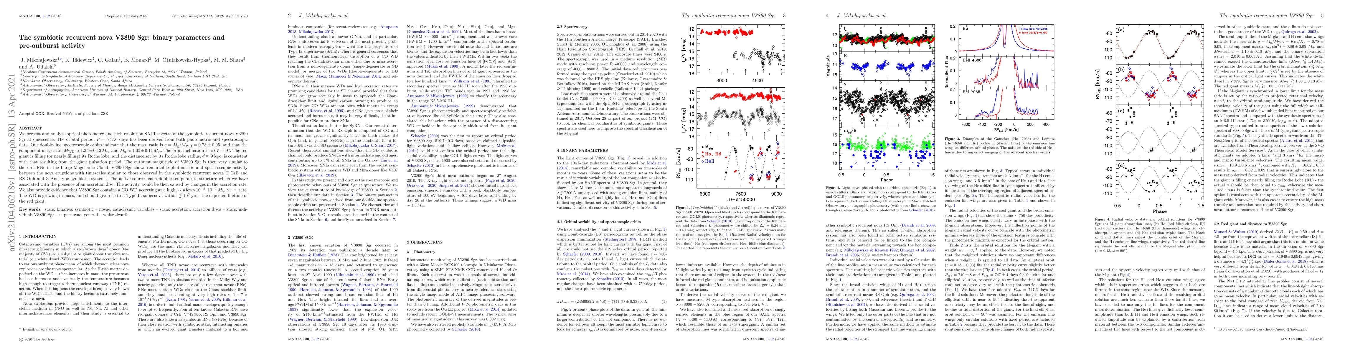 This paper analyzes optical photometry and high-resolution spectra of the symbiotic recurrent nova V3890 Sgr, determining its binary parameters and pre-outburst activity. The study finds an orbital period of 747.6 days and suggests the system contains a CO white dwarf accreting material at a high rate, predicting a Type Ia supernova within a million years.