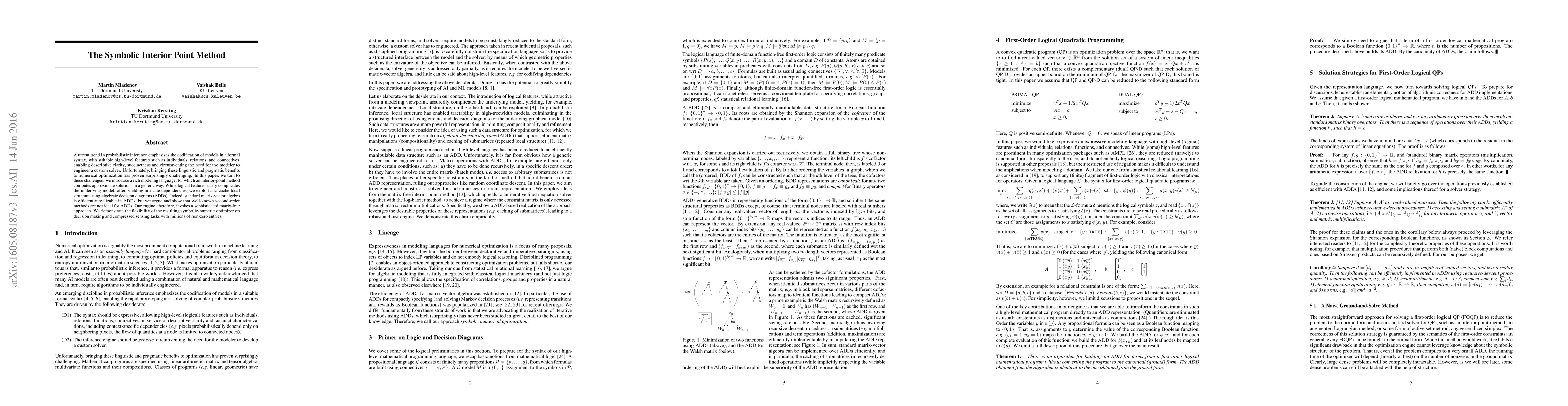 This paper introduces a symbolic interior-point method for solving optimization problems defined in a rich modeling language using algebraic decision diagrams (ADDs). The method efficiently handles intricate dependencies and leverages a sophisticated matrix-free approach to optimize large-scale decision-making and compressed sensing tasks.