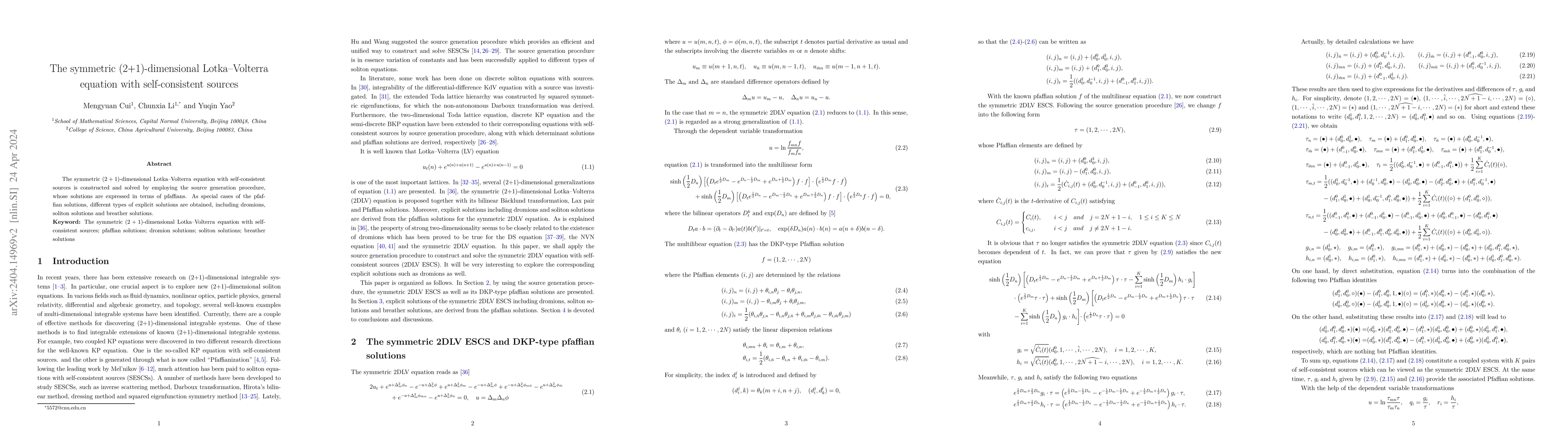 The paper constructs and solves the symmetric (2+1)-dimensional Lotka-Volterra equation with self-consistent sources using the source generation procedure, expressing solutions via pfaffians and identifying dromions, solitons, and breathers as special cases.
