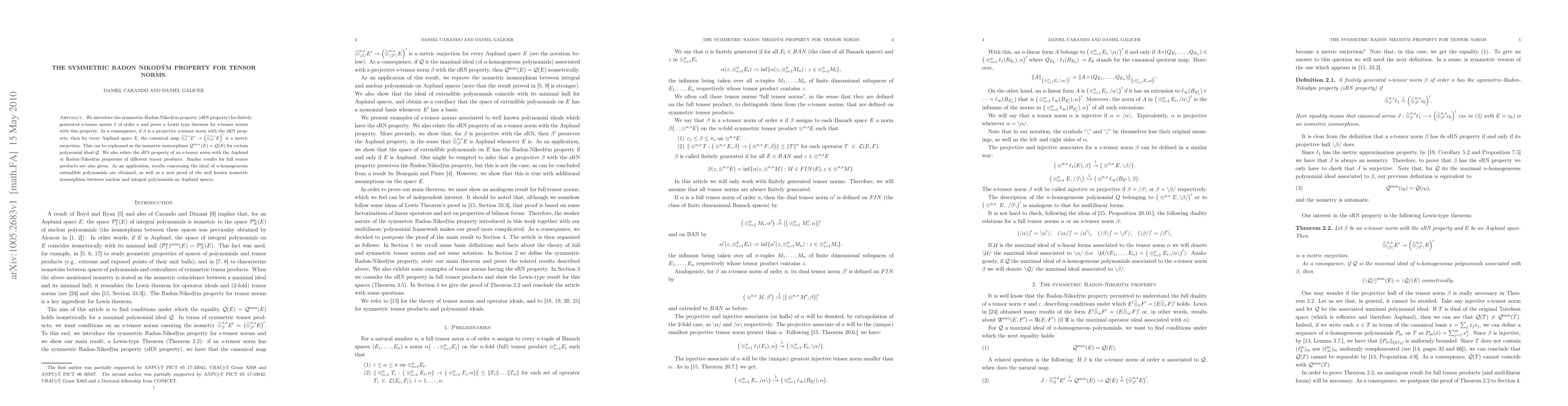 This paper introduces the symmetric-Radon-Nikod\'ym property (sRN property) for finitely generated s-tensor norms and proves a Lewis type theorem for these norms. It establishes that projective s-tensor norms with the sRN property yield metric surjections for Asplund spaces, leading to an isometric isomorphism between certain polynomial ideals.