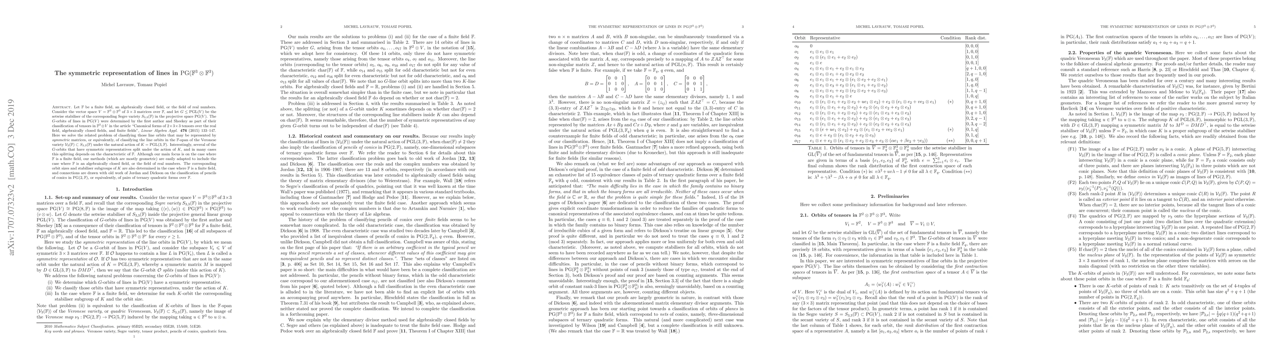 This paper classifies line orbits in $\text{PG}(\mathbb{F}^3 \otimes \mathbb{F}^3)$ that can be represented by symmetric matrices, examining how these orbits split under the action of $\text{PGL}(3,\mathbb{F})$. It reveals that the orbit splitting depends on the field's characteristic and connects these findings to classical work on ternary quadratic forms.