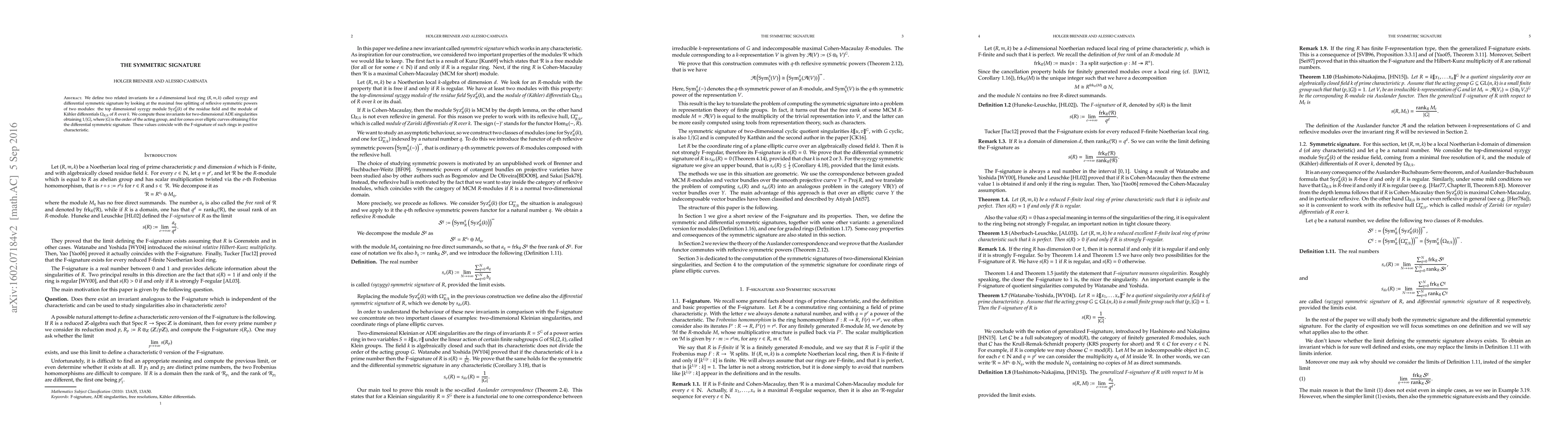 We define two related invariants for a $d$-dimensional local ring $(R,\mathfrak{m},k)$ called syzygy and differential symmetric signature by looking at the maximal free splitting of reflexive symmetric powers of two modules: the top dimensional syzygy module $\mathrm{Syz}^d_R(k)$ of the residue field and the module of K\"ahler differentials $\Omega_{R/k}$ of $R$ over $k$. We compute these invariants for two-dimensional ADE singularities obtaining $1/|G|$, where $|G|$ is the order of the acting group, and for cones over elliptic curves obtaining $0$ for the differential symmetric signature. These values coincide with the F-signature of such rings in positive characteristic.