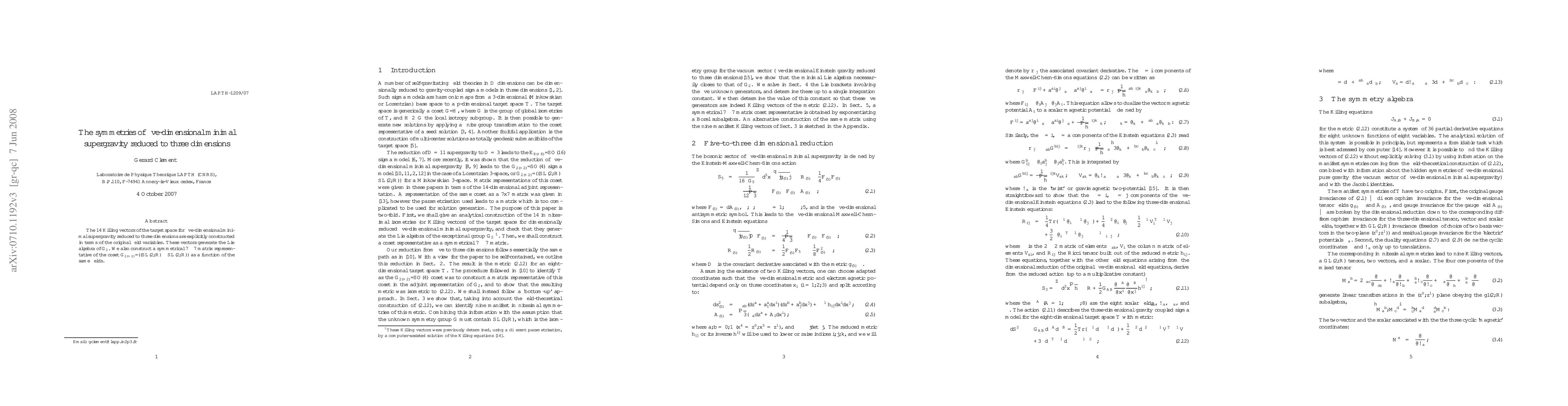 The 14 Killing vectors of the target space for five-dimensional minimal supergravity reduced to three dimensions are explicitly constructed in terms of the original field variables. These vectors generate the Lie algebra of $G_2$. We also construct a symmetrical $7\times7$ matrix representative of the coset $G_{2(+2)}/((SL(2,R)\times SL(2,R))$ as a function of the same fields.