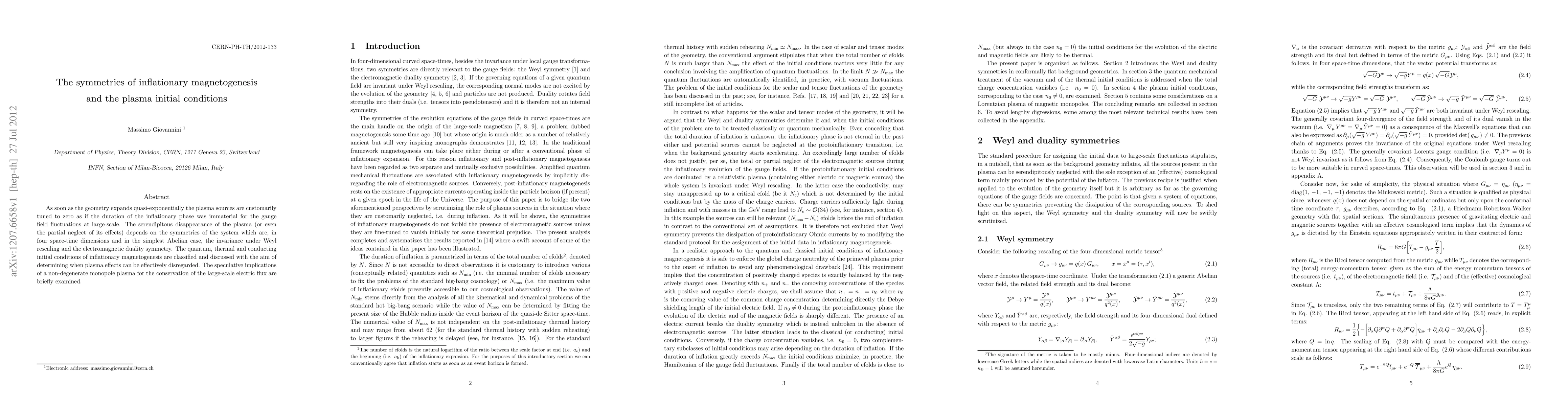 As soon as the geometry expands quasi-exponentially the plasma sources are customarily tuned to zero as if the duration of the inflationary phase was immaterial for the gauge field fluctuations at large-scale. The serendipitous disappearance of the plasma (or even the partial neglect of its effects) depends on the symmetries of the system which are, in four space-time dimensions and in the simplest Abelian case, the invariance under Weyl rescaling and the electromagnetic duality symmetry. The quantum, thermal and conducting initial conditions of inflationary magnetogenesis are classified and discussed with the aim of determining when plasma effects can be effectively disregarded. The speculative implications of a non-degenerate monopole plasma for the conservation of the large-scale electric flux are briefly examined.