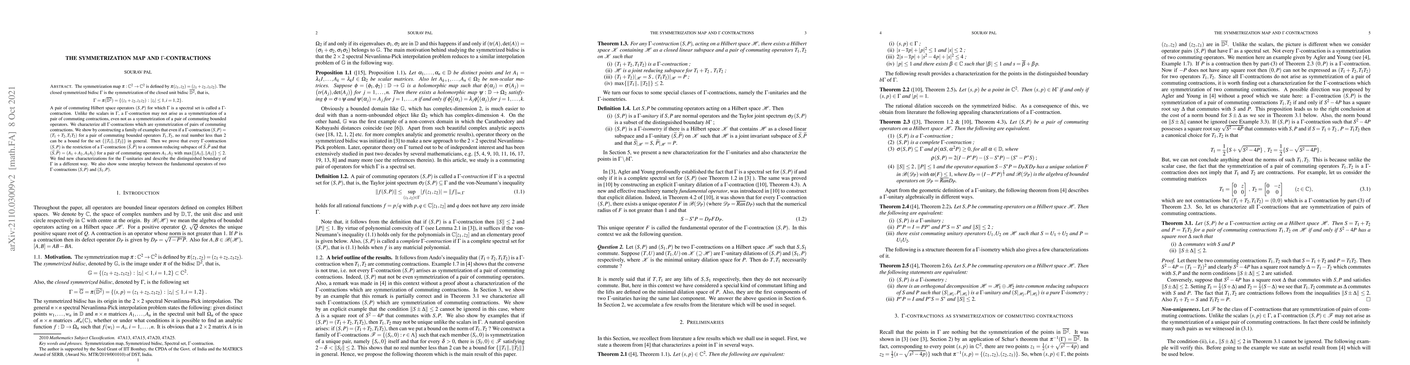 The symmetrization map $\pi:\mathbb C^2\rightarrow \mathbb C^2$ is defined by $ \pi(z_1,z_2)=(z_1+z_2,z_1z_2). $ The closed symmetrized bidisc $\Gamma$ is the symmetrization of the closed unit bidisc $\overline{\mathbb D^2}$, that is, \[ \Gamma = \pi(\overline{\mathbb D^2})=\{ (z_1+z_2,z_1z_2)\,:\, |z_i|\leq 1, i=1,2 \}. \] A pair of commuting Hilbert space operators $(S,P)$ for which $\Gamma$ is a spectral set is called a $\Gamma$-contraction. Unlike the scalars in $\Gamma$, a $\Gamma$-contraction may not arise as a symmetrization of a pair of commuting contractions, even not as a symmetrization of a pair of commuting bounded operators. We characterize all $\Gamma$-contractions which are symmetrization of pairs of commuting contractions. We show by constructing a family of examples that even if a $\Gamma$-contraction $(S,P)=(T_1+T_2,T_1T_2)$ for a pair of commuting bounded operators $T_1,T_2$, no real number less than $2$ can be a bound for the set $\{ \|T_1\|,\|T_2\| \}$ in general. Then we prove that every $\Gamma$-contraction $(S,P)$ is the restriction of a $\Gamma$-contraction $(\widetilde S, \widetilde P)$ to a common reducing subspace of $\widetilde S, \widetilde P$ and that $(\widetilde S, \widetilde P)=(A_1+A_2,A_1A_2)$ for a pair of commuting operators $A_1,A_2$ with $\max \{\|A_1\|, \|A_2\|\} \leq 2$. We find new characterizations for the $\Gamma$-unitaries and describe the distinguished boundary of $\Gamma$ in a different way. We also show some interplay between the fundamental operators of two $\Gamma$-contractions $(S,P)$ and $(S_1,P)$.
