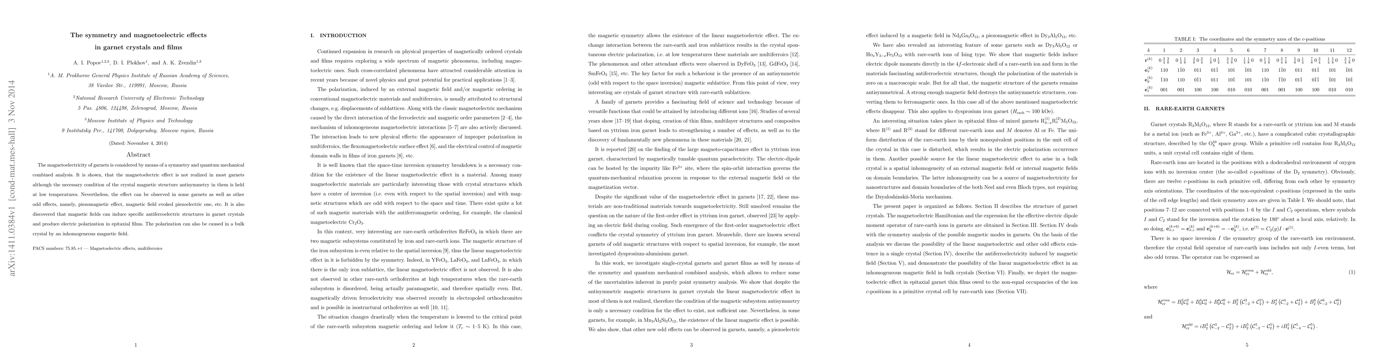 This paper combines symmetry and quantum mechanical analysis to explore magnetoelectricity in garnet crystals and films, revealing that while most garnets lack the magnetoelectric effect due to antisymmetry in their magnetic structure, certain garnets exhibit it along with other phenomena like piezomagnetic and piezomagnetic-induced piezoelectric effects. It also finds that magnetic fields can induce antiferroelectric structures and electric polarization in both garnet crystals and epitaxial films.