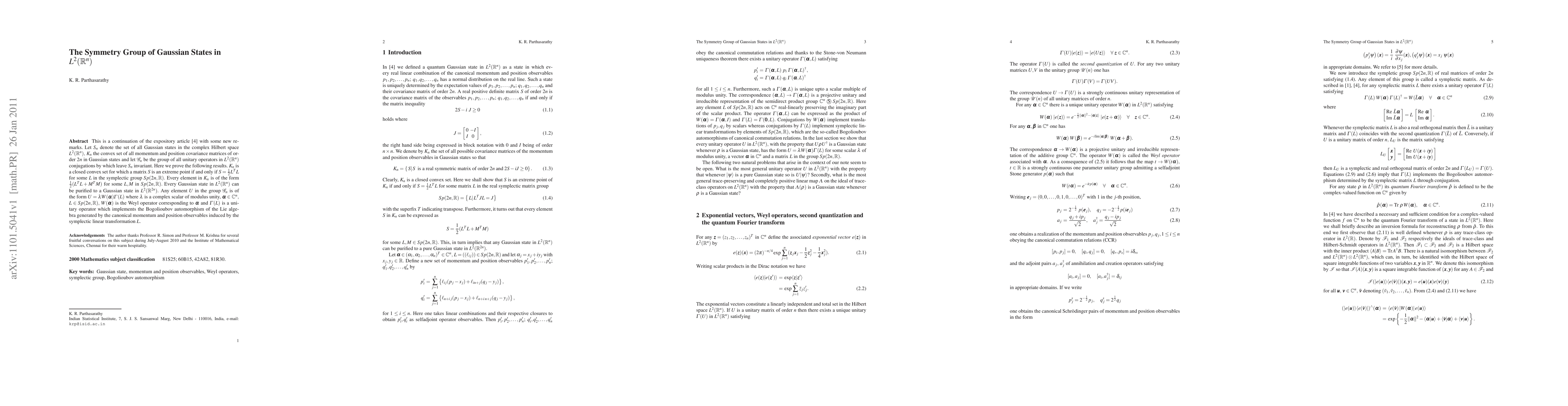 This is a continuation of the expository article \cite{krp} with some new remarks. Let $S_n$ denote the set of all Gaussian states in the complex Hilbert space $L^2 (\mathbb{R}^n),$ $K_n$ the convex set of all momentum and position covariance matrices of order $2n$ in Gaussian states and let $\mathcal{G}_n$ be the group of all unitary operators in $L^2 (\mathbb{R}^n)$ conjugations by which leave $S_n$ invariant. Here we prove the following results. $K_n$ is a closed convex set for which a matrix $S$ is an extreme point if and only if $S=\frac{1}{2} L^{T} L$ for some $L$ in the symplectic group $Sp (2n, \mathbb{R}).$ Every element in $K_n$ is of the form $\frac{1}{2} (L^{T} L + M^{T} M)$ for some $L,M$ in $Sp (2n, \mathbb{R}).$ Every Gaussian state in $L^2 (\mathbb{R}^n)$ can be purified to a Gaussian state in $L^2 (\mathbb{R}^{2n}).$ Any element $U$ in the group $\mathcal{G}_n$ is of the form $U = \lambda W ({\bm {\alpha}}) \Gamma (L)$ where $\lambda$ is a complex scalar of modulus unity, ${\bm {\alpha}} \in \mathbb{C}^n,$ $L \in Sp (2n, \mathbb{R}),$ $W({\bm {\alpha}})$ is the Weyl operator corresponding to ${\bm {\alpha}} $ and $\Gamma (L)$ is a unitary operator which implements the Bogolioubov automorphism of the Lie algebra generated by the canonical momentum and position observables induced by the symplectic linear transformation $L.$