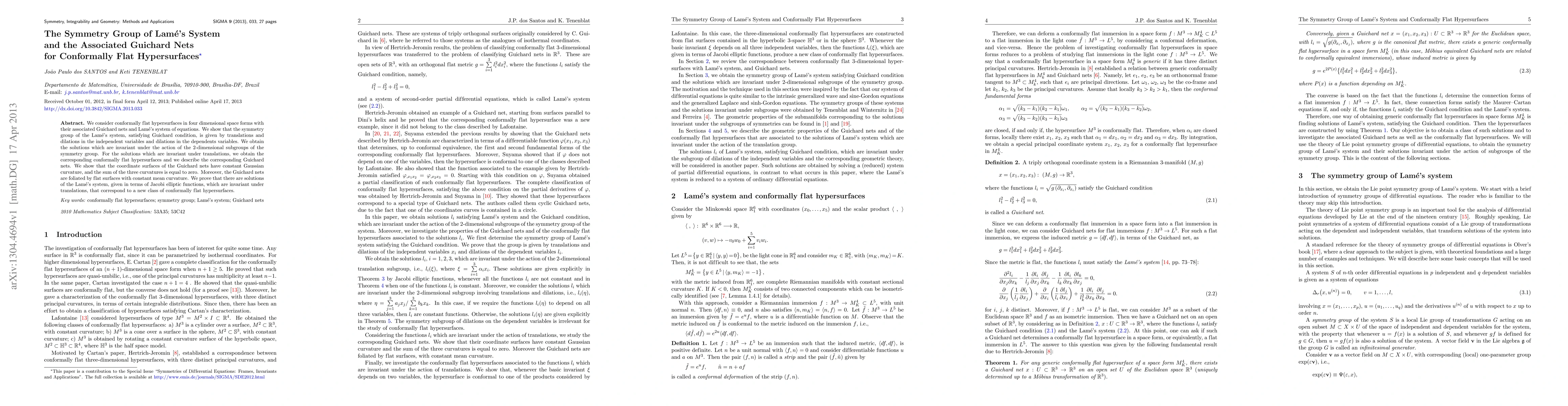 We consider conformally flat hypersurfaces in four dimensional space forms with their associated Guichard nets and Lam\'e's system of equations. We show that the symmetry group of the Lam\'e's system, satisfying Guichard condition, is given by translations and dilations in the independent variables and dilations in the dependents variables. We obtain the solutions which are invariant under the action of the 2-dimensional subgroups of the symmetry group. For the solutions which are invariant under translations, we obtain the corresponding conformally flat hypersurfaces and we describe the corresponding Guichard nets. We show that the coordinate surfaces of the Guichard nets have constant Gaussian curvature, and the sum of the three curvatures is equal to zero. Moreover, the Guichard nets are foliated by flat surfaces with constant mean curvature. We prove that there are solutions of the Lam\'e's system, given in terms of Jacobi elliptic functions, which are invariant under translations, that correspond to a new class of conformally flat hypersurfaces.