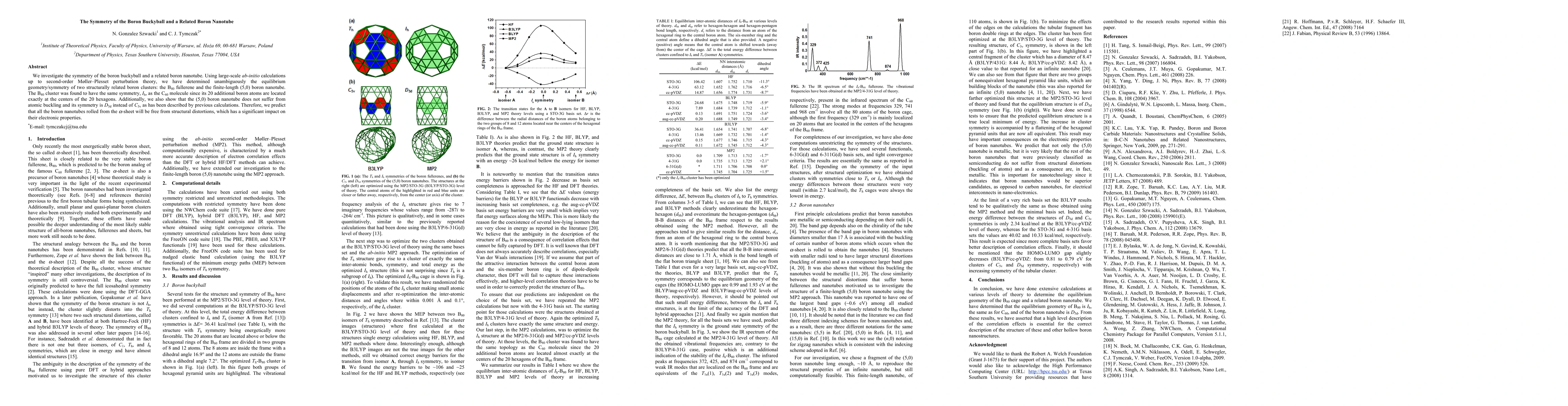 This paper determines the equilibrium geometry and symmetry of the B80 boron buckyball and a (5,0) boron nanotube using ab-initio calculations. The B80 buckyball exhibits Ih symmetry similar to C60, while the boron nanotube has D5d symmetry, differing from previous reports, which could influence their electronic properties.