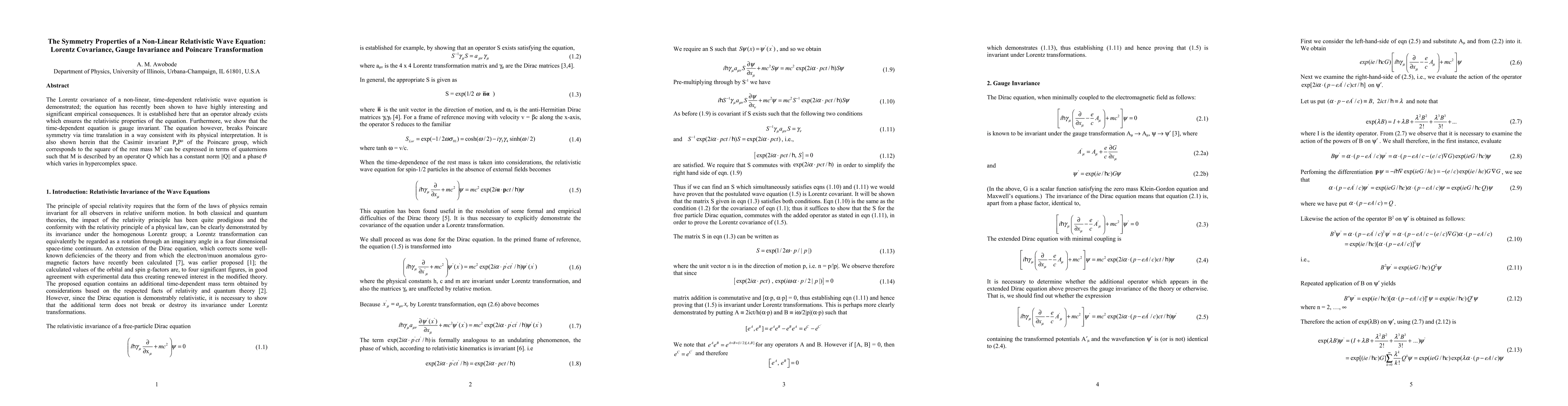 The Lorentz covariance of a non-linear, time-dependent relativistic wave equation is demonstrated; the equation has recently been shown to have highly interesting and significant empirical consequences. It is established here that an operator already exists which ensures the relativistic properties of the equation. Furthermore, we show that the time-dependent equation is gauge invariant. The equation however, breaks Poincare symmetry via time translation in a way consistent with its physical interpretation. It is also shown herein that the Casimir invariant PmuPmu of the Poincare group, which corresponds to the square of the rest mass M-squared can be expressed in terms of quaternions such that M is described by an operator Q which has a constant norm and a phase phi which varies in hypercomplex space.