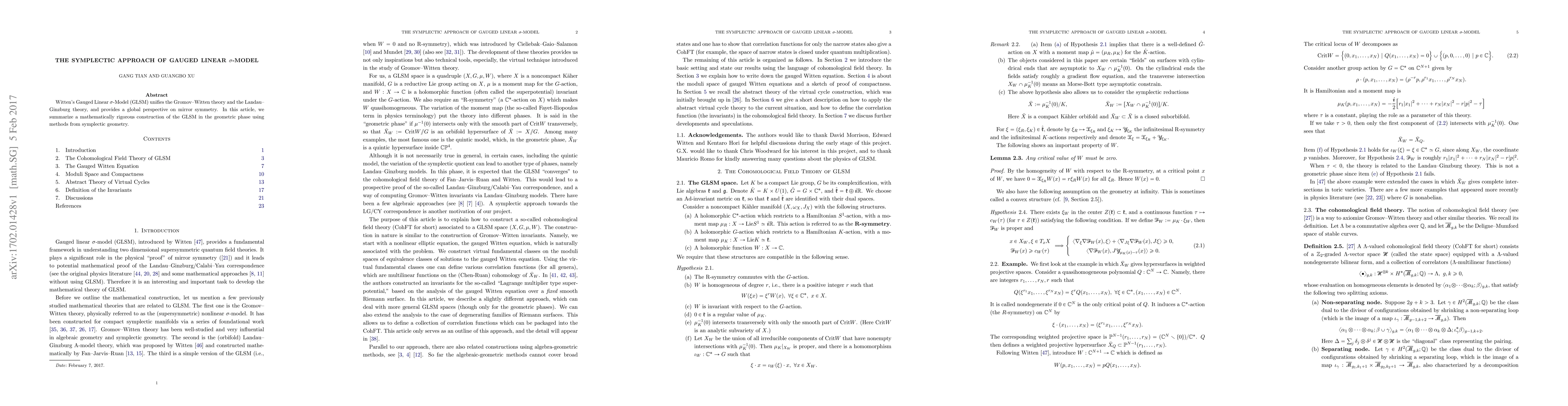 Witten's Gauged Linear $\sigma$-Model (GLSM) unifies the Gromov-Witten theory and the Landau-Ginzburg theory, and provides a global perspective on mirror symmetry. In this article, we summarize a mathematically rigorous construction of the GLSM in the geometric phase using methods from symplectic geometry.
