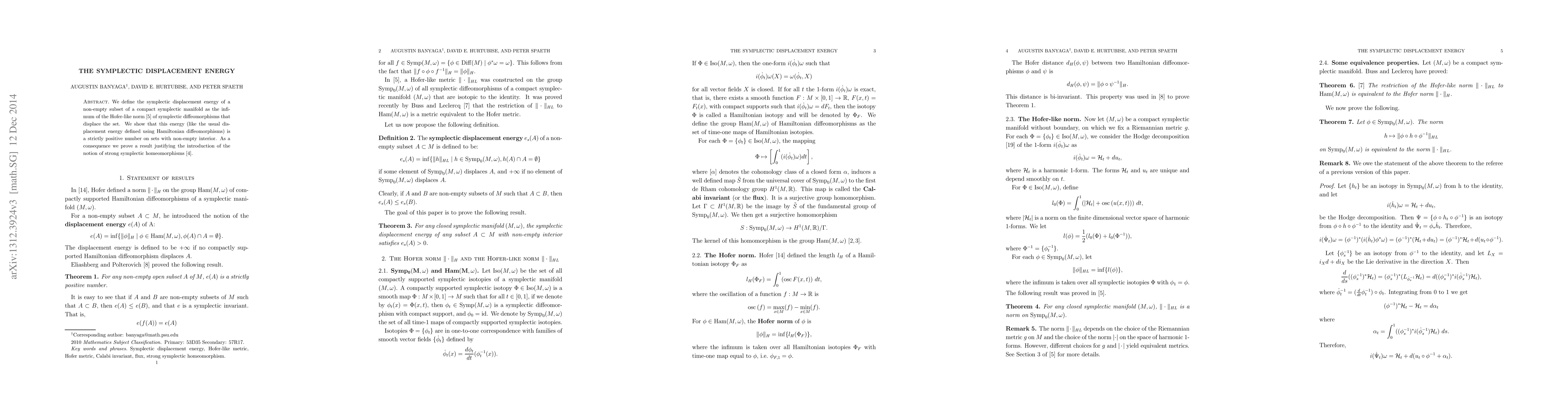 We define the symplectic displacement energy of a non-empty subset of a compact symplectic manifold as the infimum of the Hofer-like norm [5] of symplectic diffeomorphisms that displace the set. We show that this energy (like the usual displacement energy defined using Hamiltonian diffeomorphisms) is a strictly positive number on sets with non-empty interior. As a consequence we prove a result justifying the introduction of the notion of strong symplectic homeomorphisms [4].