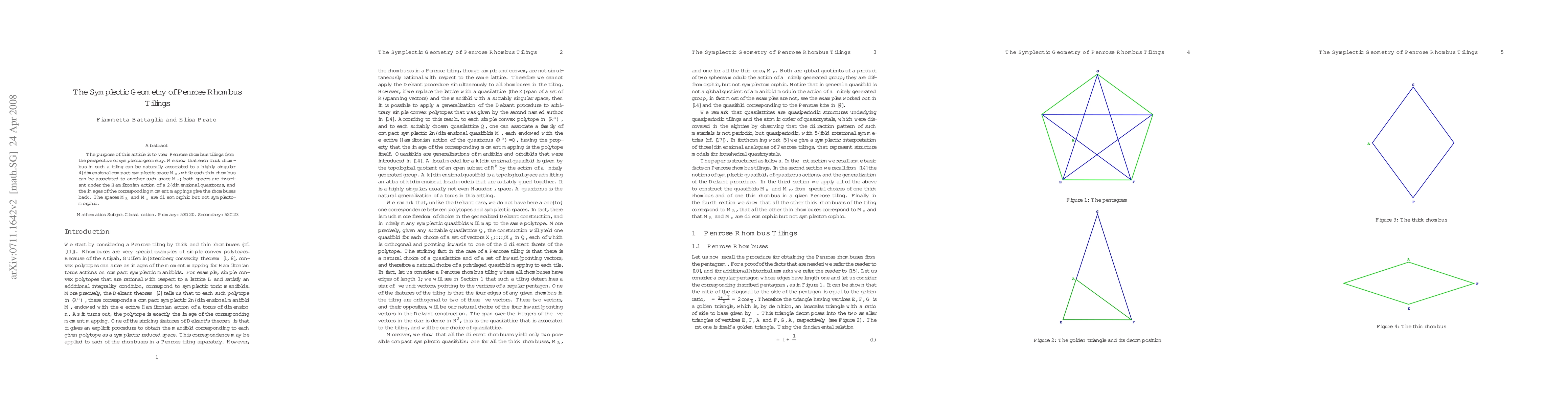 This paper explores Penrose rhombus tilings through the lens of symplectic geometry, revealing that thick and thin rhombuses correspond to distinct singular 4-dimensional symplectic spaces, both invariant under a Hamiltonian action, though they are diffeomorphic but not symplectomorphic.