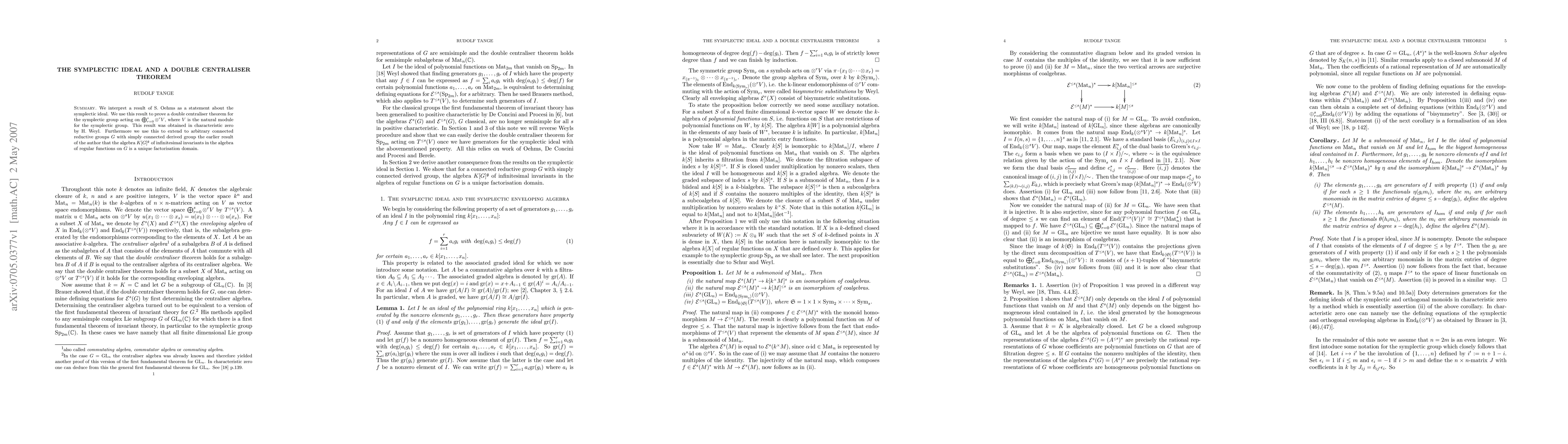 We interpret a result of S. Oehms as a statement about the symplectic ideal. We use this result to prove a double centraliser theorem for the symplectic group acting on \bigoplus_{r=0}^s\otimes^rV, where V is the natural module for the symplectic group. This result was obtained in characteristic zero by H. Weyl. Furthermore we use this to extend to arbitrary connected reductive groups G with simply connected derived group the earlier result of the author that the algebra K[G]^g of infinitesimal invariants in the algebra of regular functions on G is a unique factorisation domain.