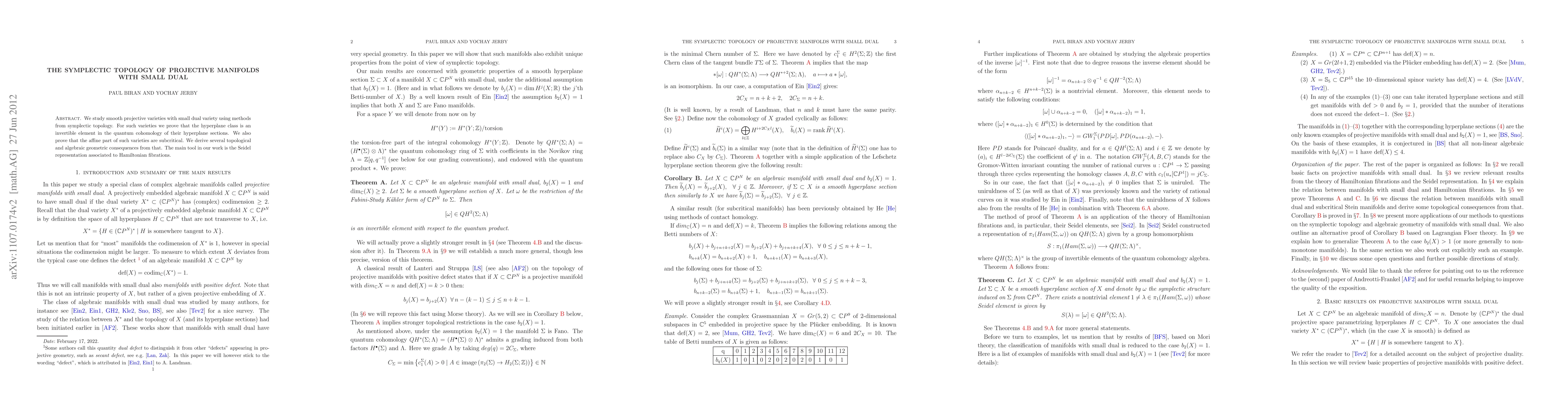 We study smooth projective varieties with small dual variety using methods from symplectic topology. We prove the affine parts of such varieties are subcritical, and that the hyperplane class is invertible in their quantum cohomology. We derive several topological and algebraic geometric consequences from that. The main tool in our work is the Seidel representation associated to Hamiltonian fibrations.
