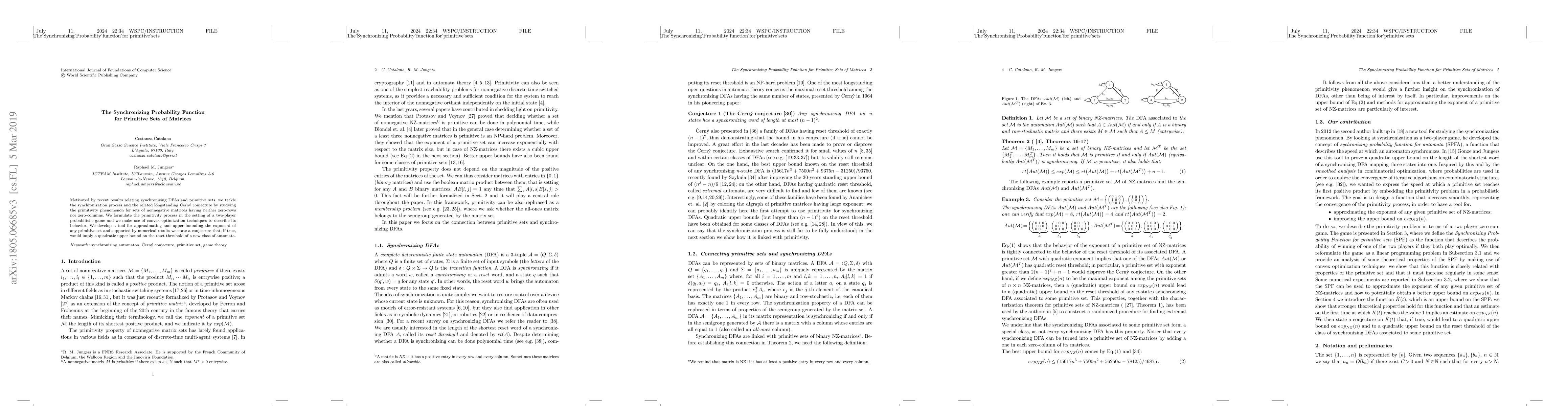 This paper explores the synchronization process for sets of nonnegative matrices, using convex optimization techniques to study primitivity and develop a probabilistic game framework. It proposes a method to approximate the exponent of primitive sets and suggests a conjecture that could lead to a quadratic upper bound on the reset threshold for a new class of automata.