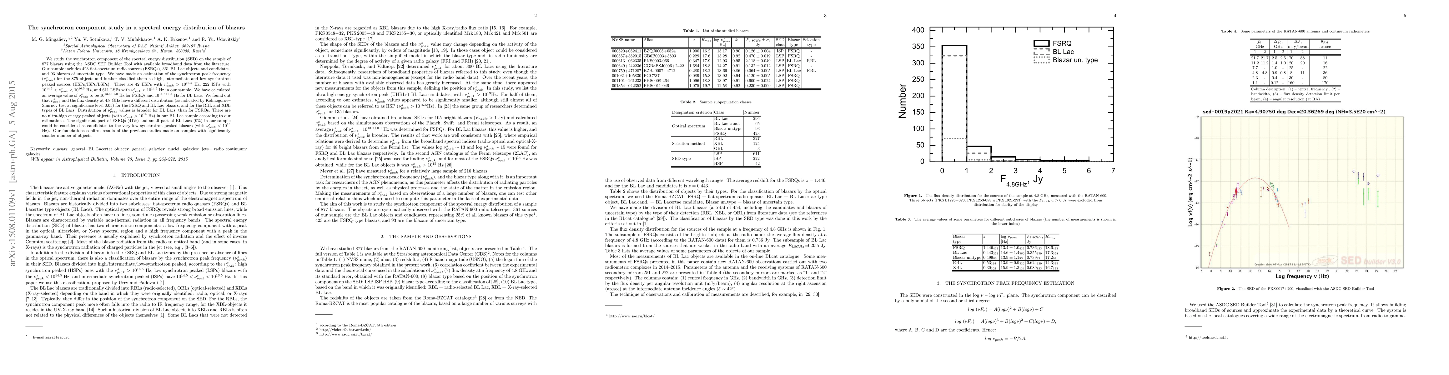 We study the synchrotron component of the spectral energy distribution (SED) on the sample of 877 blazars using the ASDC SED Builder Tool with available broadband data from the literature. Our sample includes 423 flat-spectrum radio sources (FSRQs), 361 BL Lac objects and candidates, and 93 blazars of uncertain type. We have made an estimation of the synchrotron peak frequency ($\nu_{peak}^{s}$) for the 875 objects and further classified them as high, intermediate and low synchrotron peaked sources (HSPs/ISPs/LSPs). There are 42 HSPs with $\nu_{peak}^{s} > 10^{16.5}$ Hz, 222 ISPs with $10^{14.5} < \nu_{peak}^{s} < 10^{16.5}$ Hz, and 611 LSPs with $\nu_{peak}^{s} < 10^{14.5}$ Hz in our sample. We have calculated an average value of $\nu_{peak}^{s}$ to be $10^{13.4 \pm 1.0}$ Hz for FSRQs and $10^{14.6 \pm 1.4}$ Hz for BL Lacs. We found out that $\nu_{peak}^{s}$ and the flux density at 4.8 GHz have a different distribution (as indicated by Kolmogorov-Smirnov test at significance level 0.05) for the FSRQ and BL Lac blazars, and for the RBL and XBL types of BL Lacs. Distribution of $\nu_{peak}^{s}$ values is broader for BL Lacs, than for FSRQs. There are no ultra-high energy peaked objects (with $\nu_{peak}^{s} > 10^{19}$ Hz) in our BL Lac sample according to our estimations. The significant part of FSRQs (41%) and small part of BL Lacs (9%) in our sample could be considered as candidates to the very-low synchrotron peaked blazars (with $\nu_{peak}^{s} < 10^{13}$ Hz). Our foundations confirm results of the previous studies made on samples with significantly smaller number of objects.