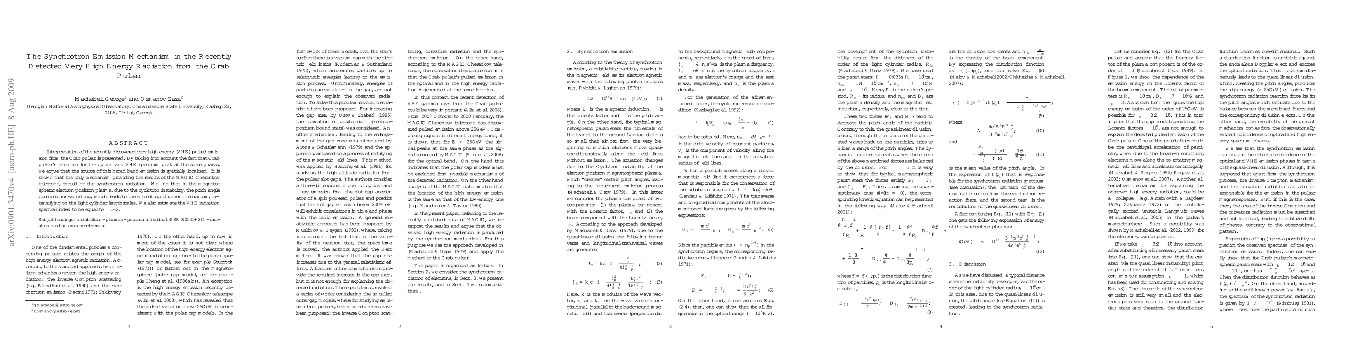 The paper suggests that synchrotron radiation is responsible for the recently detected very high energy pulses from the Crab pulsar, with a spectral index of -1/2.