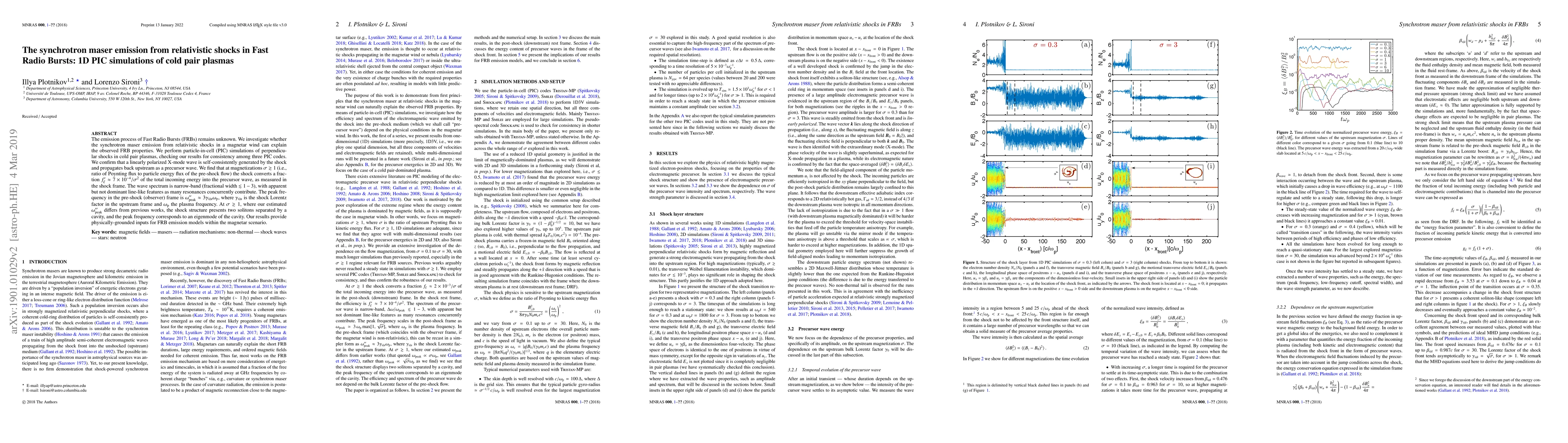 This paper investigates the synchrotron maser emission from relativistic shocks in magnetar winds as a potential explanation for Fast Radio Bursts (FRBs) using 1D PIC simulations. The study finds that shocks with magnetizations $\sigma\gtrsim 1$ can convert a fraction of the incoming energy into a linearly polarized X-mode wave, providing a narrow-band spectrum that aligns with observed FRB properties.