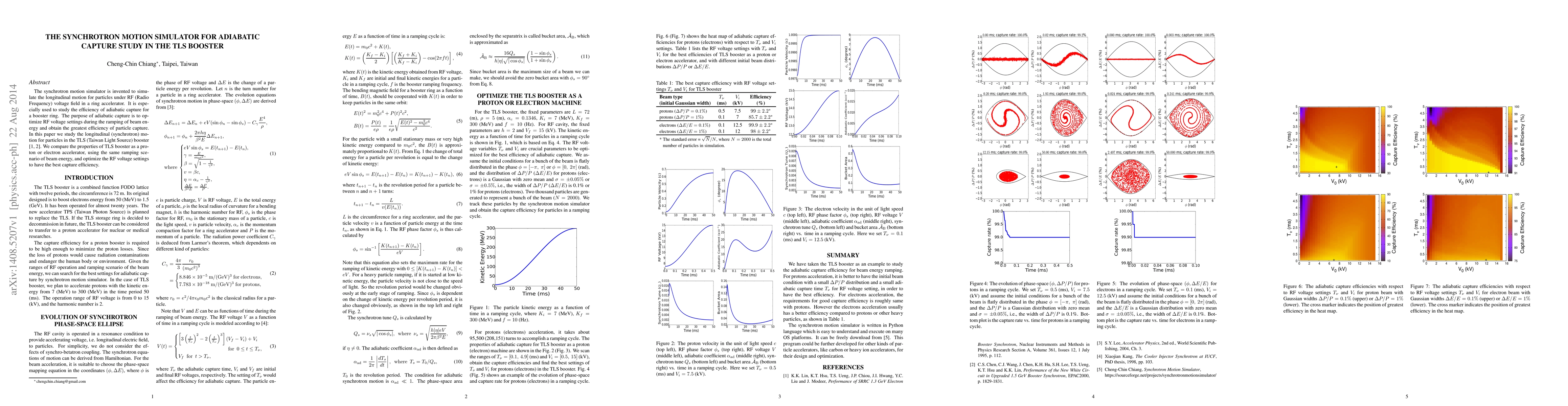 This paper introduces a synchrotron motion simulator to study the efficiency of adiabatic capture in the TLS booster ring, comparing proton and electron accelerator scenarios. The goal is to optimize RF voltage settings for maximum particle capture efficiency during beam energy ramping.