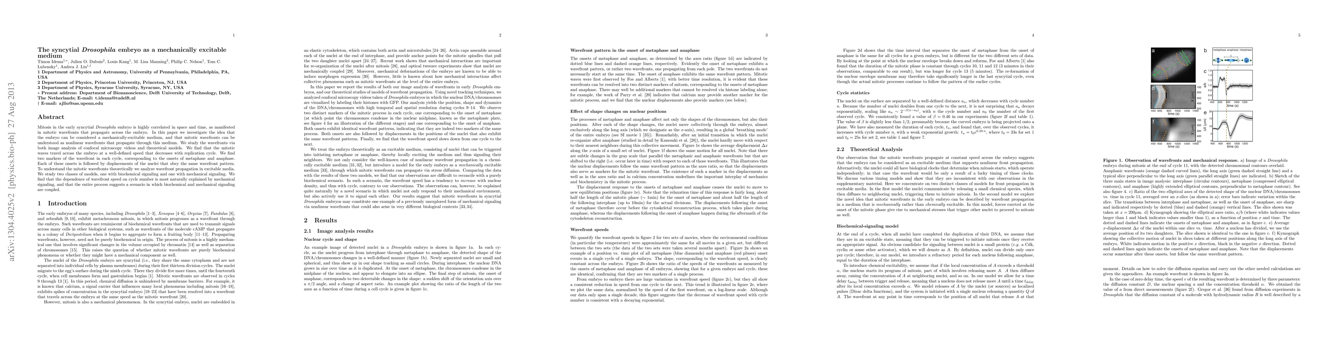 This paper explores the early syncytial Drosophila embryo as a mechanically excitable medium, demonstrating that mitotic wavefronts propagate through it. The study combines confocal microscopy and theoretical models to show that wavefronts slow down with each cycle, suggesting a coupling of biochemical and mechanical signaling.